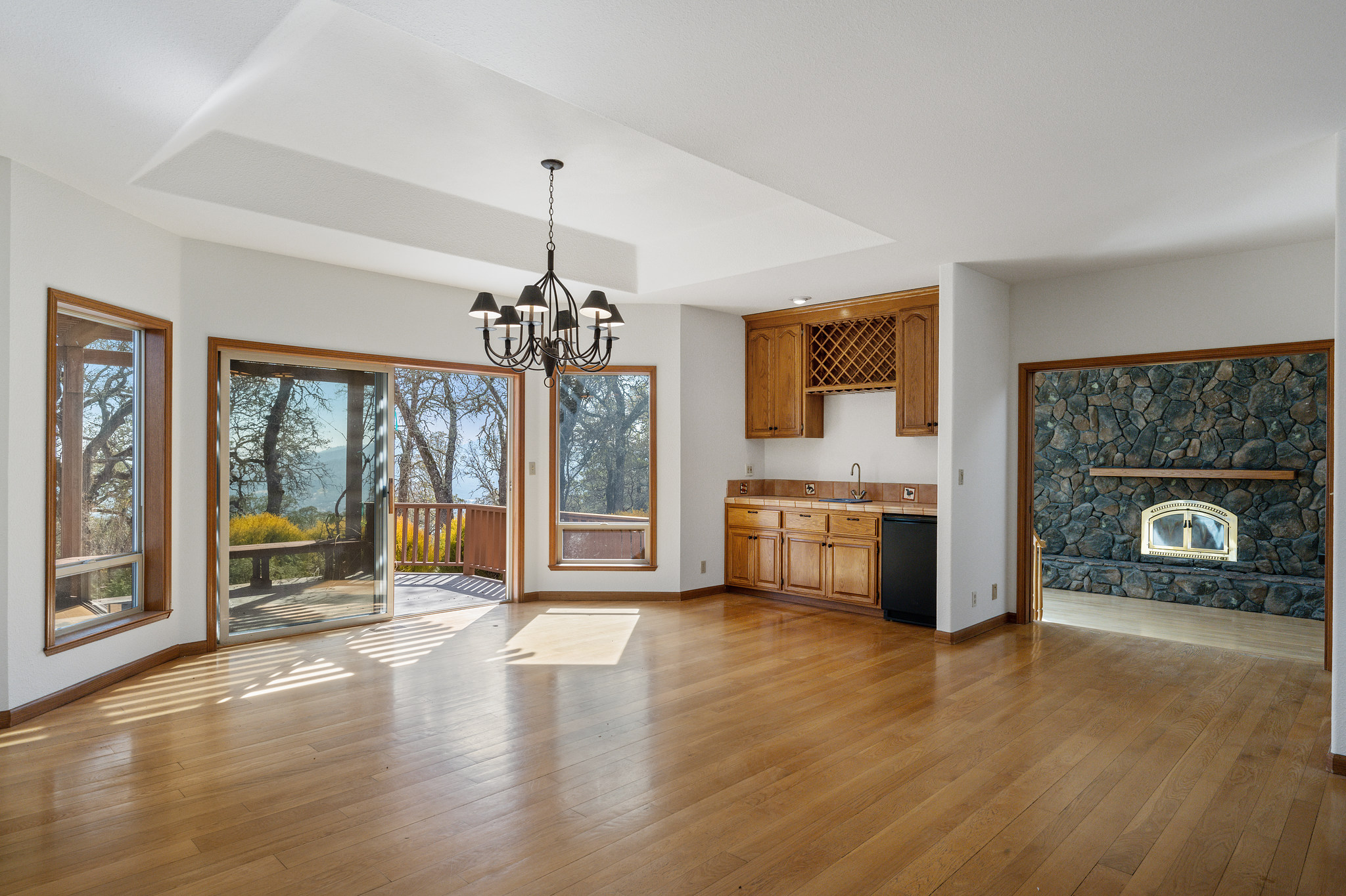 Step up to the formal dining room featuring chandelier, wet bar with refrigerator, and sliding glass door to an al fresco view deck