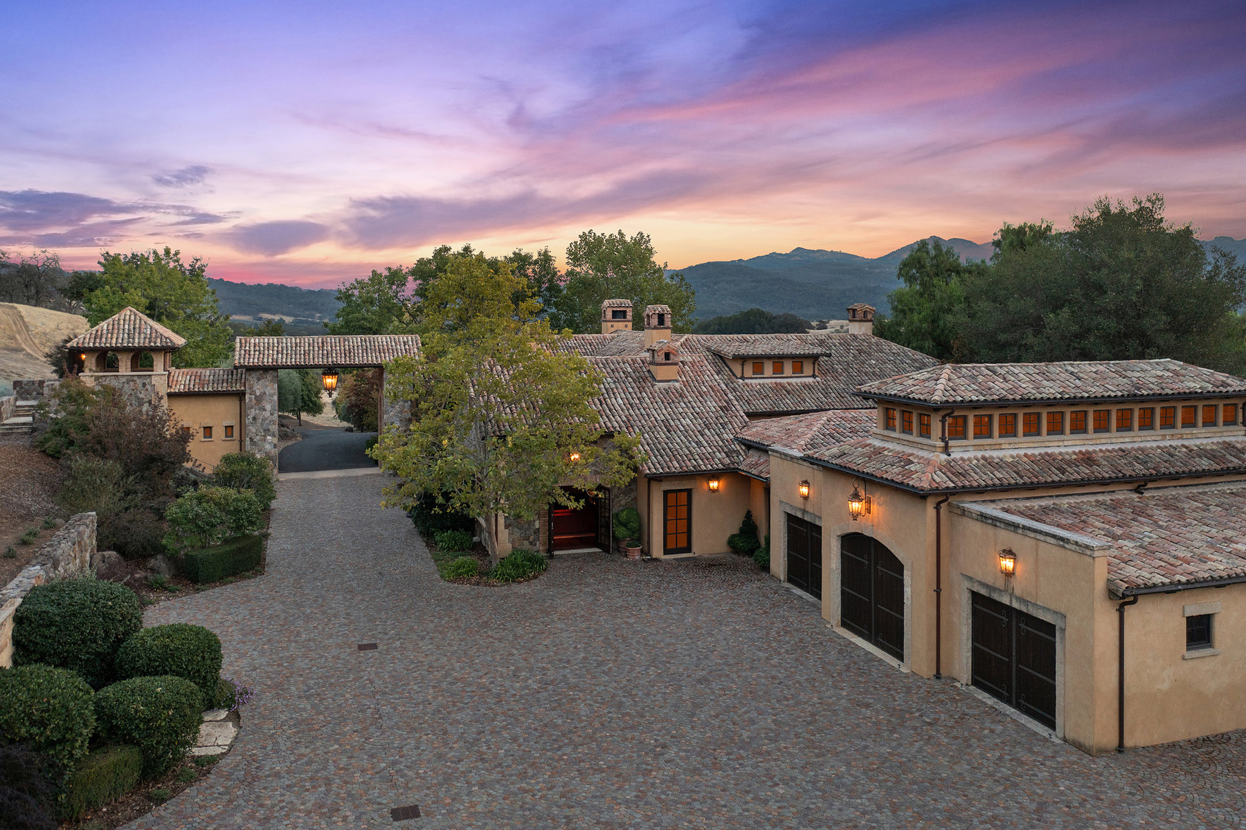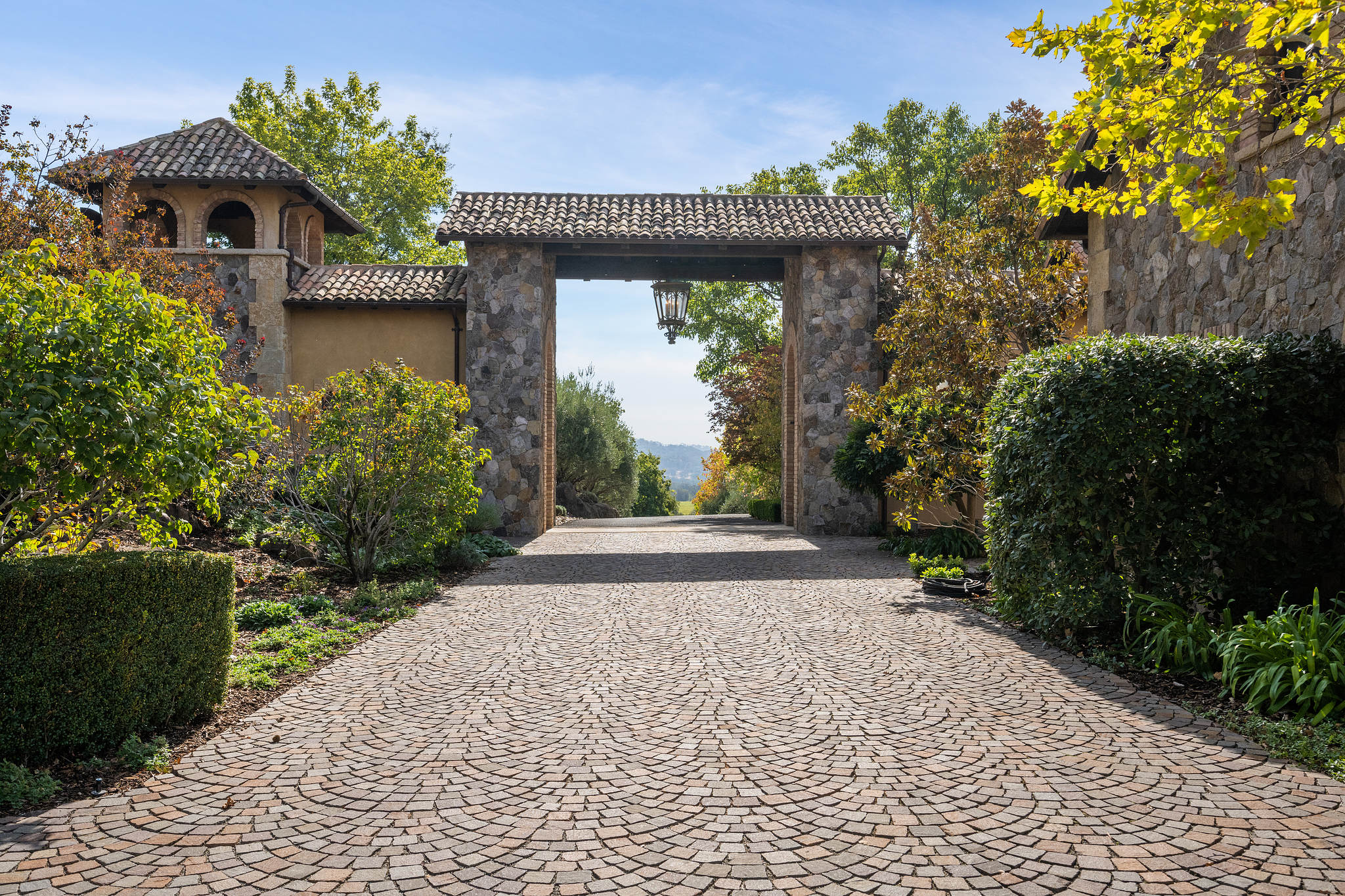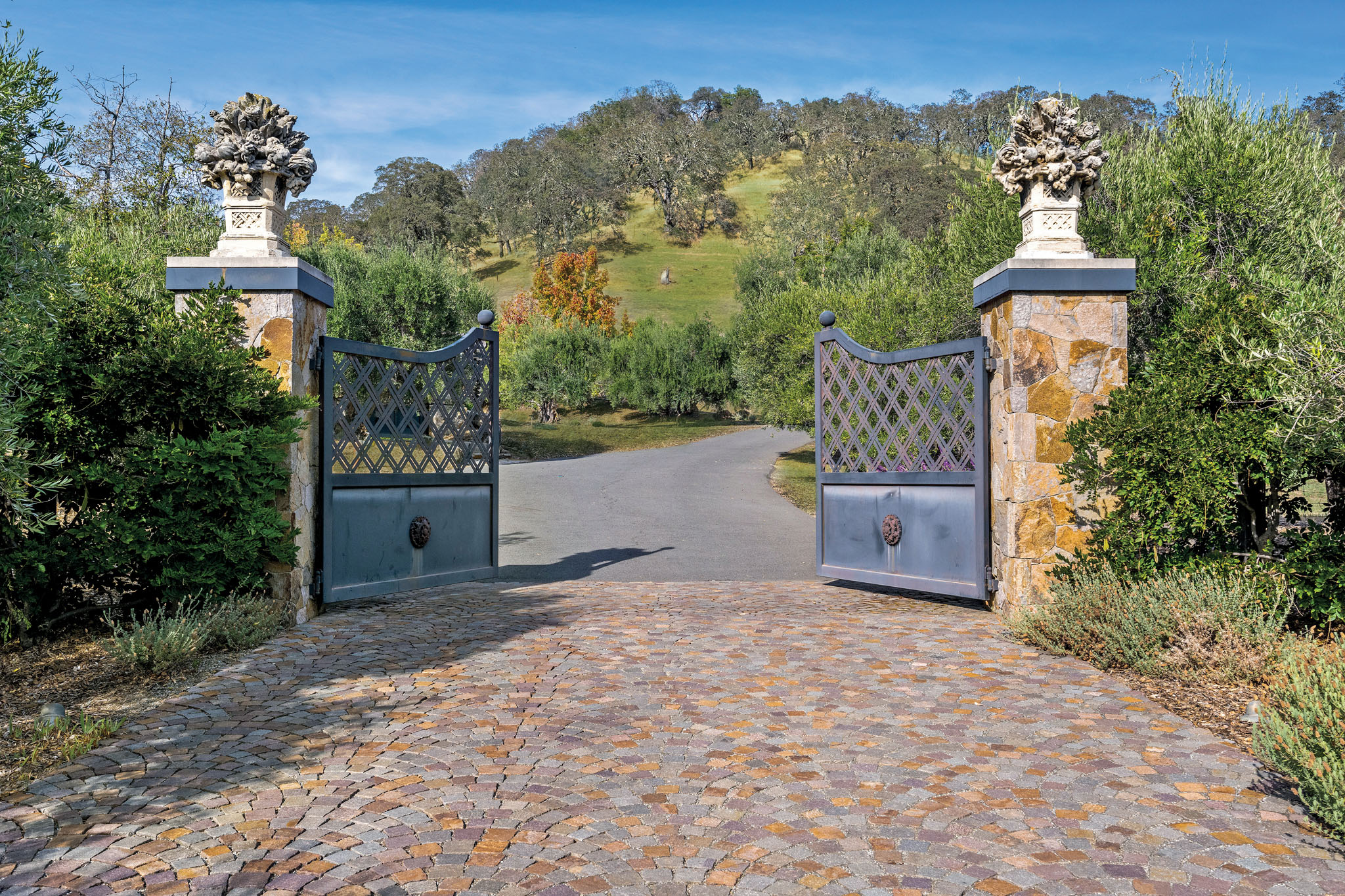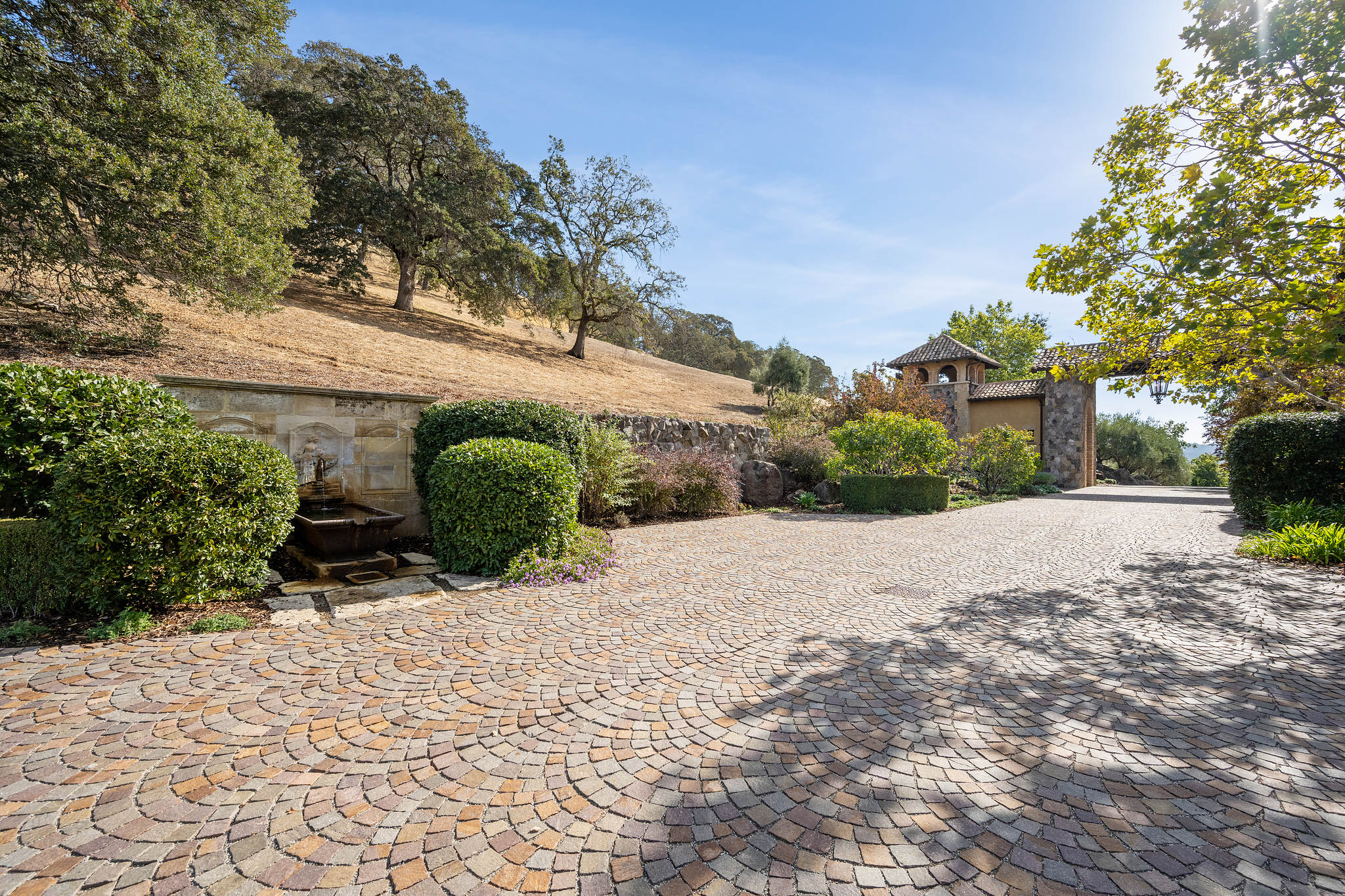 Impressive gated entrance lined with olive trees; a porte cochère connects the main residence with the wine tower; beyond is a grand motor court of concentric patterned cobblestones with access to the car museum; an antique fountain from L’Isle-sur-la-Sorgue in France enhances the setting