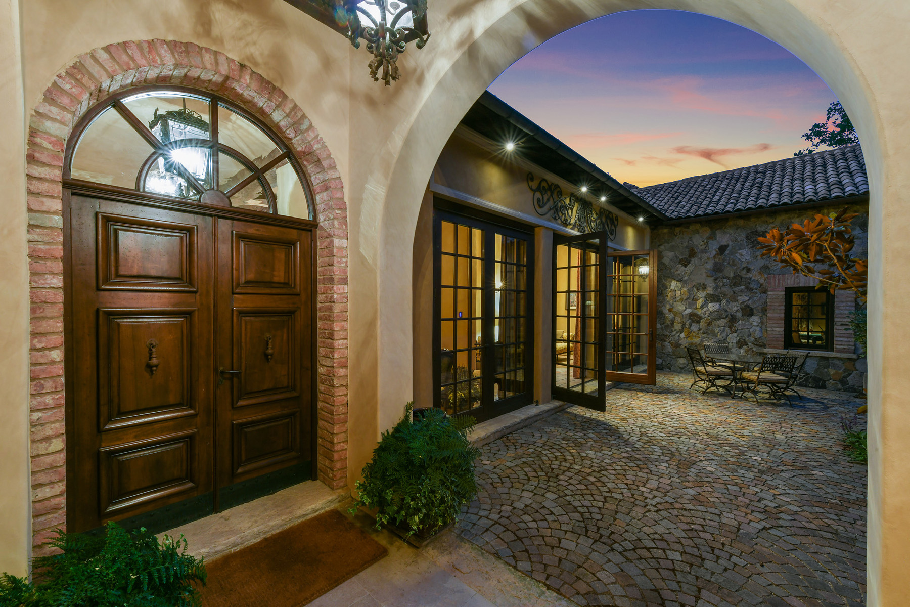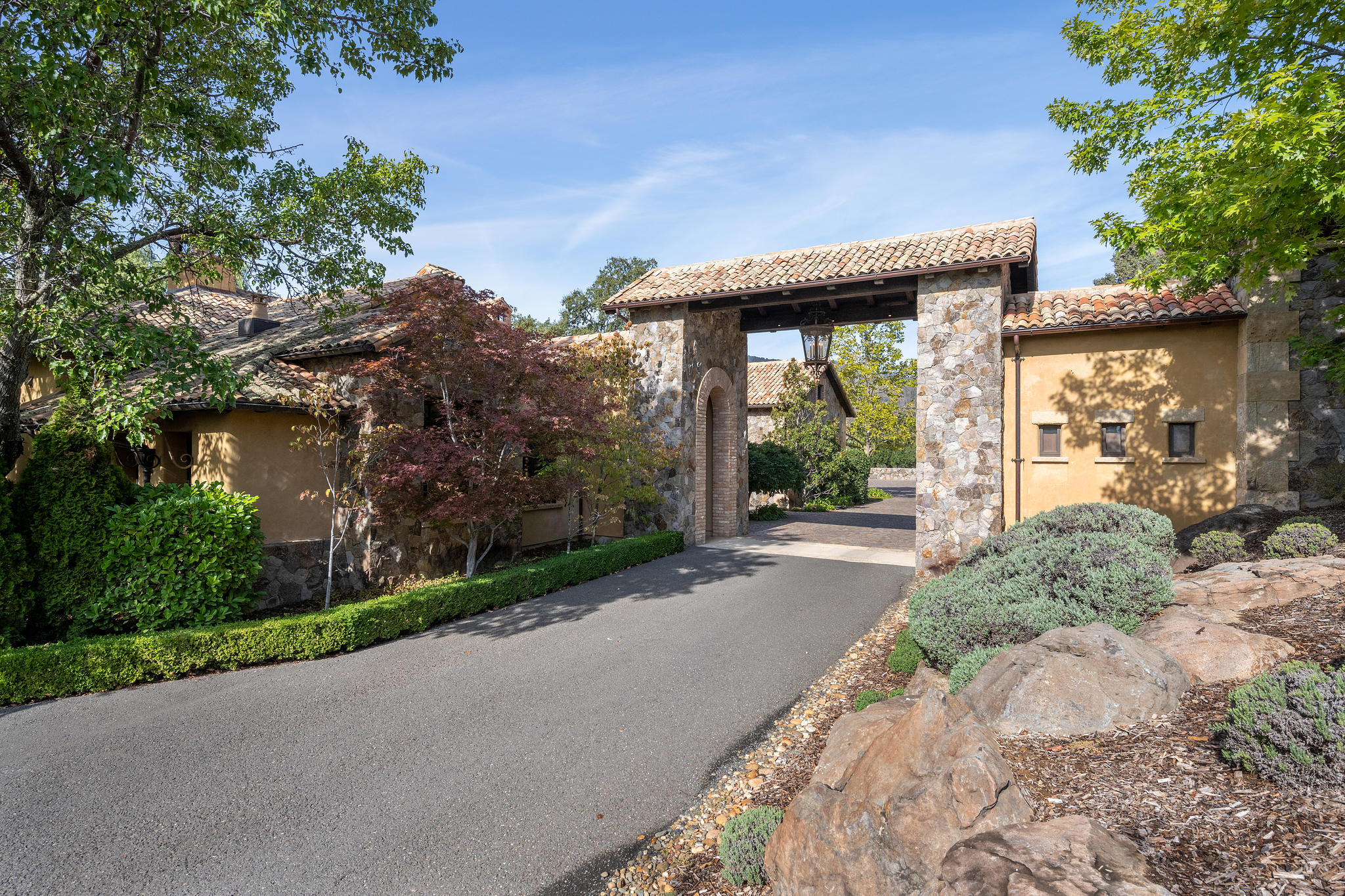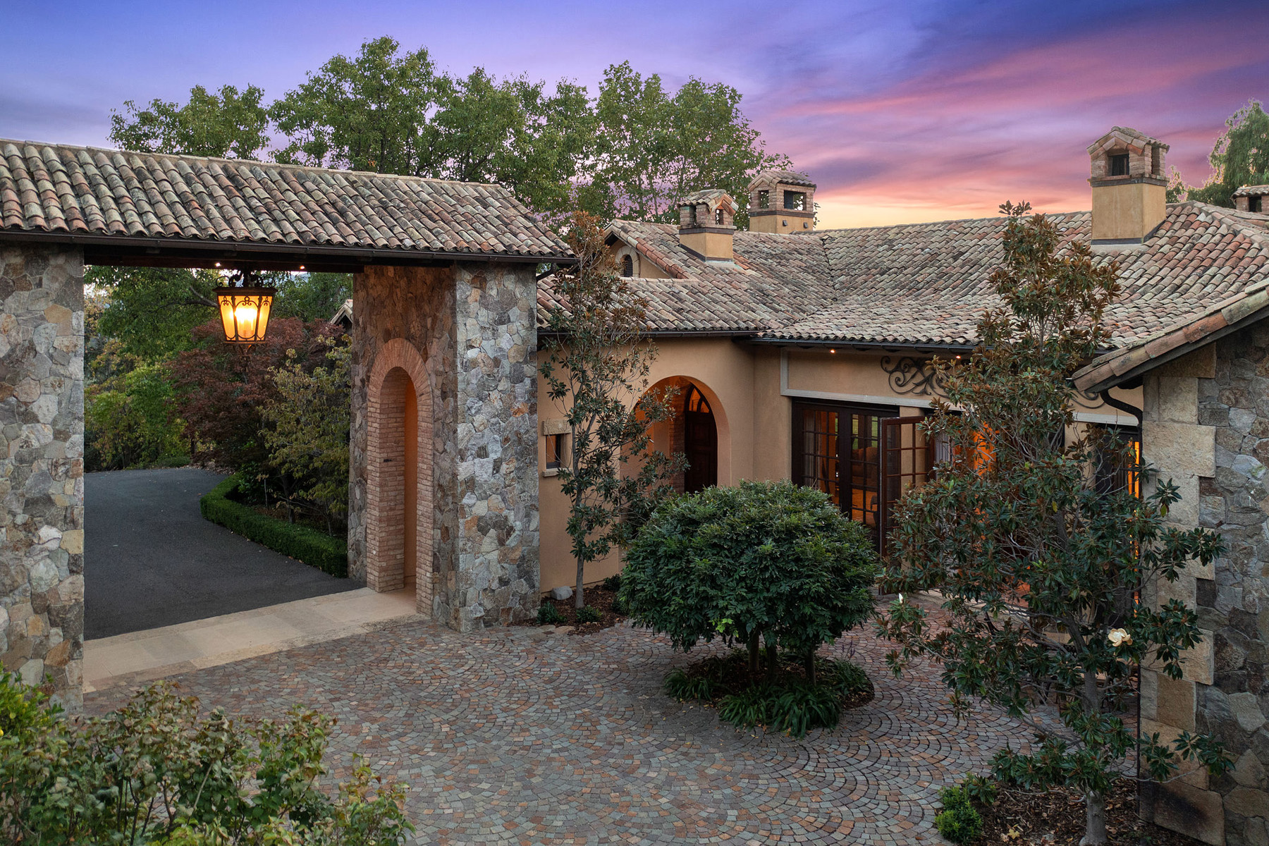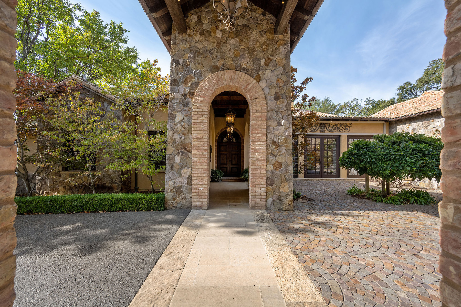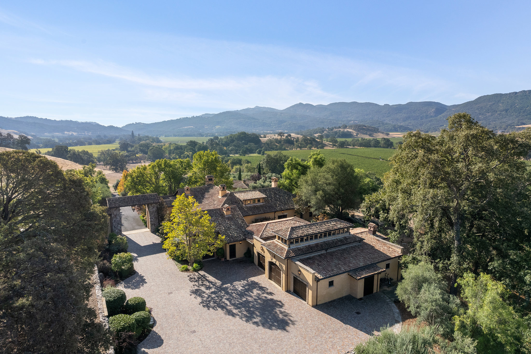 Impressive gated entrance lined with olive trees; a porte cochère connects the main residence with the wine tower; beyond is a grand motor court of concentric patterned cobblestones with access to the car museum; an antique fountain from L’Isle-sur-la-Sorgue in France enhances the setting