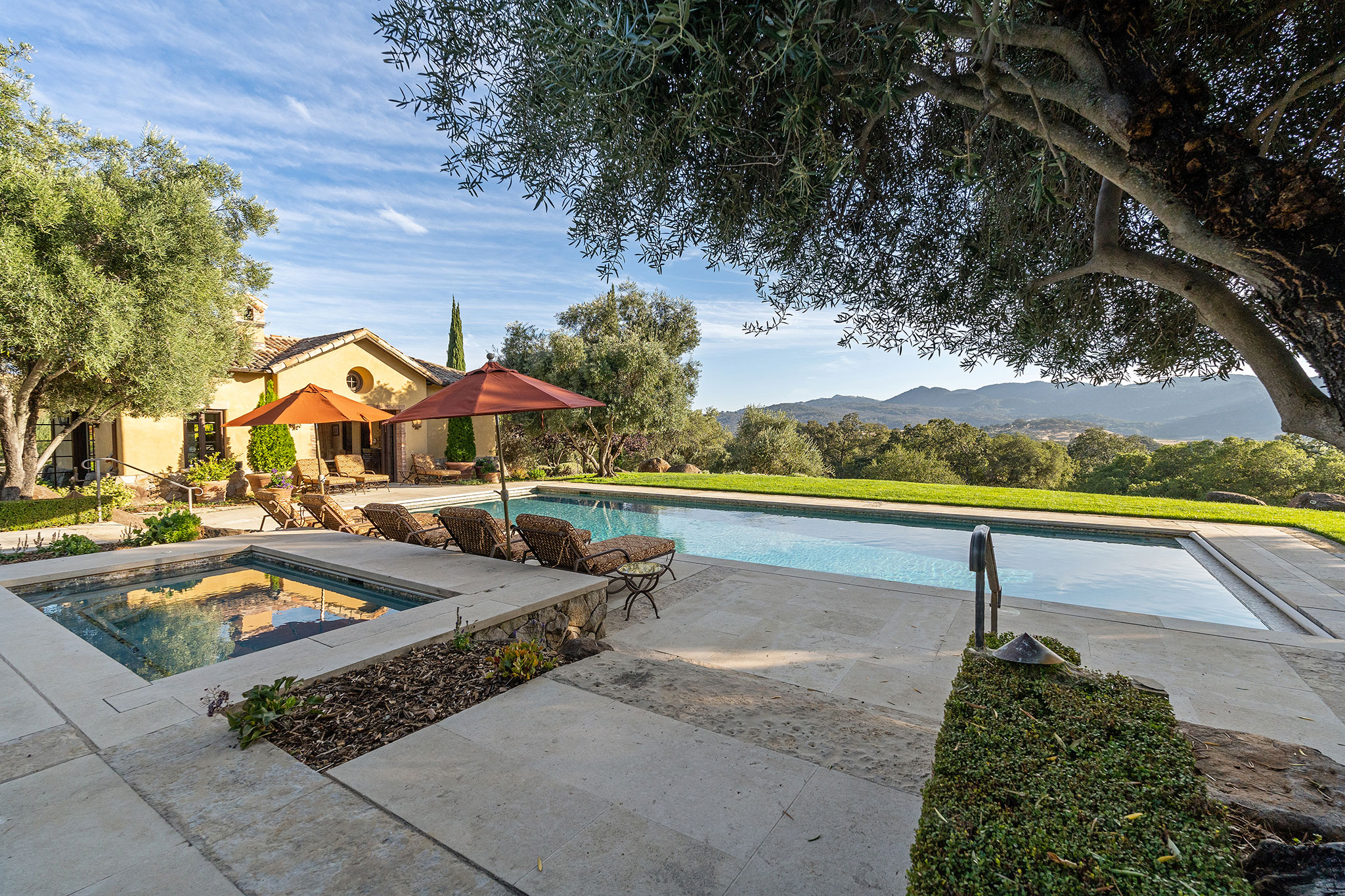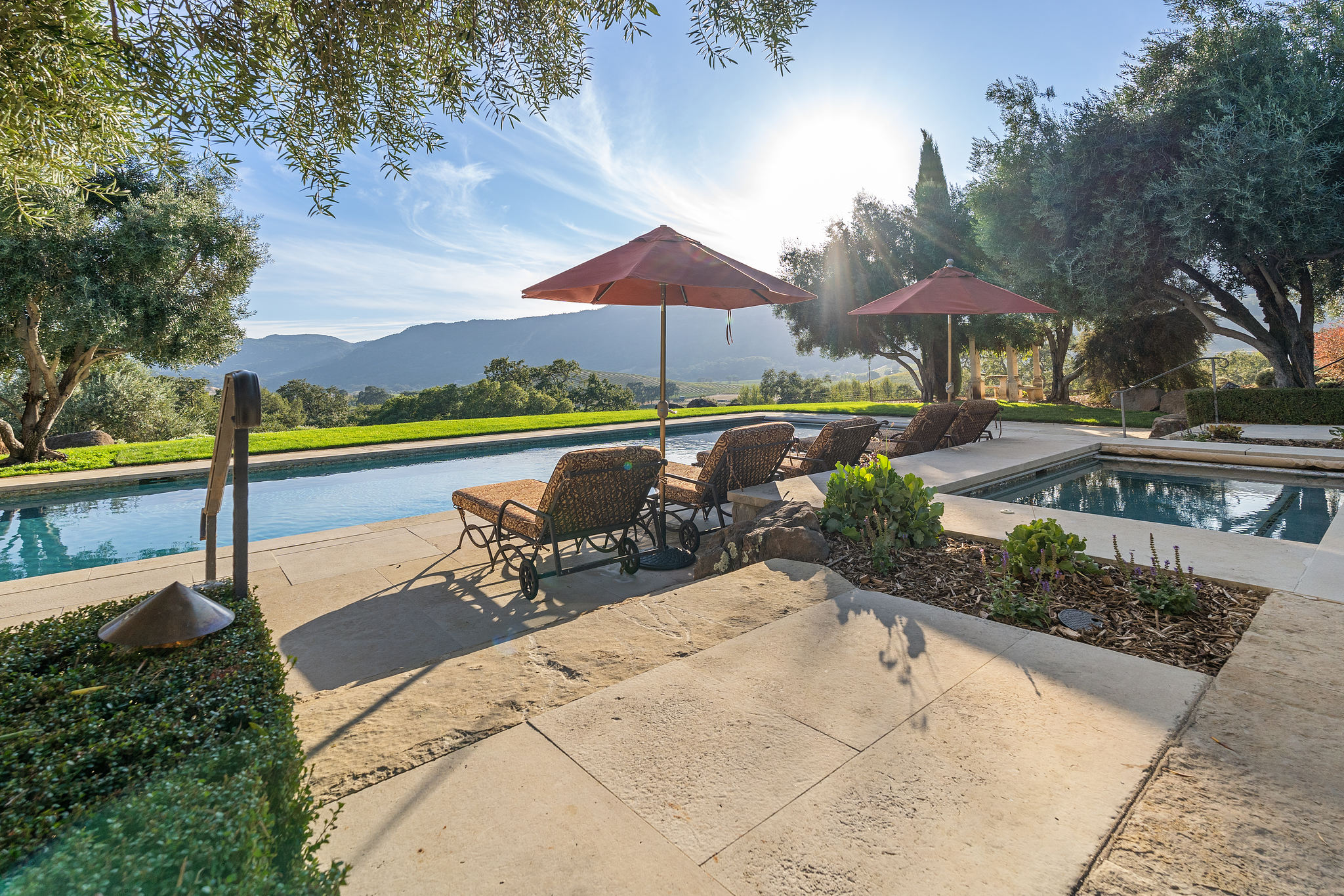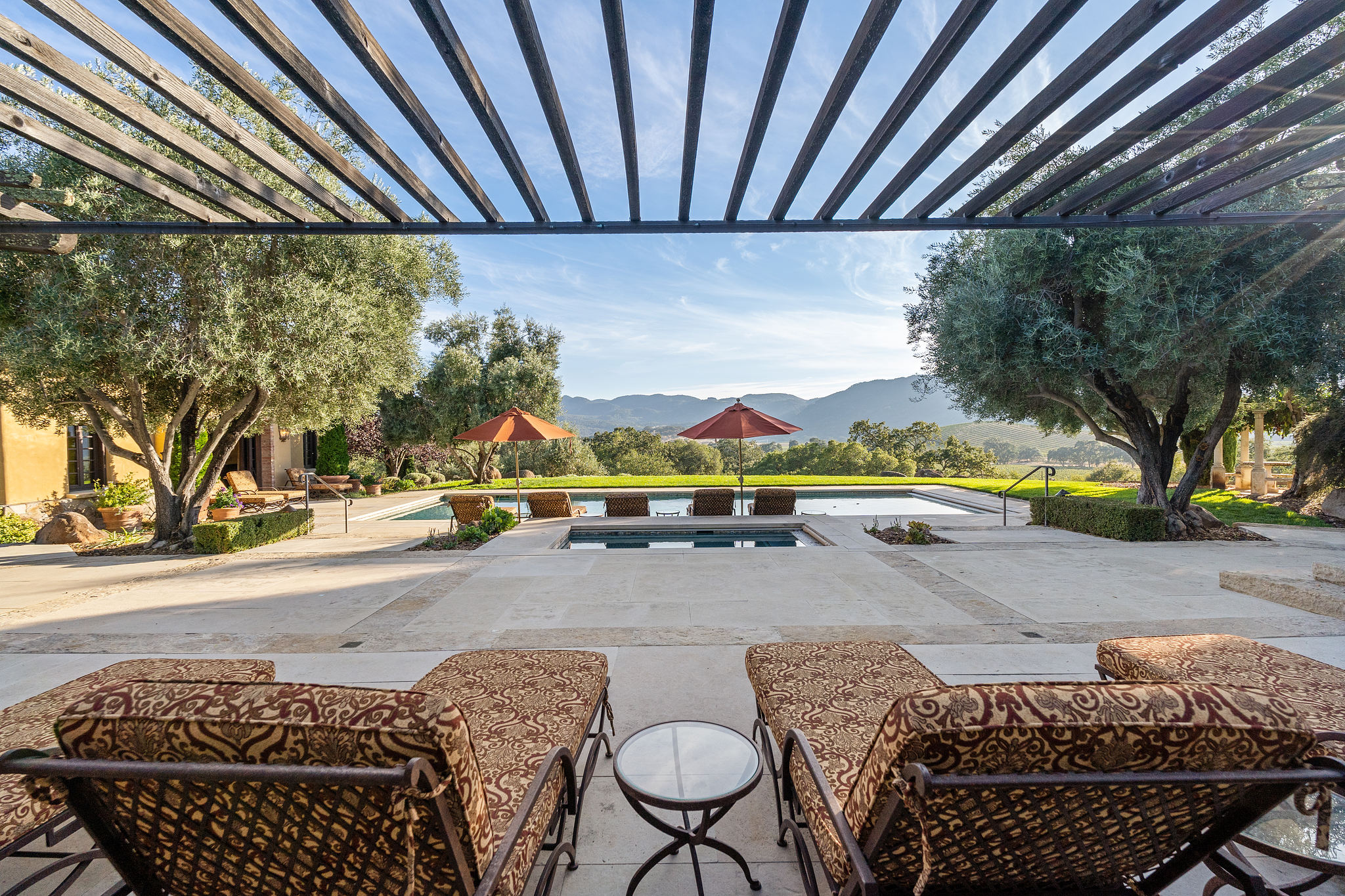 Pool and separate spa with arbor-covered lounge with cooling misters