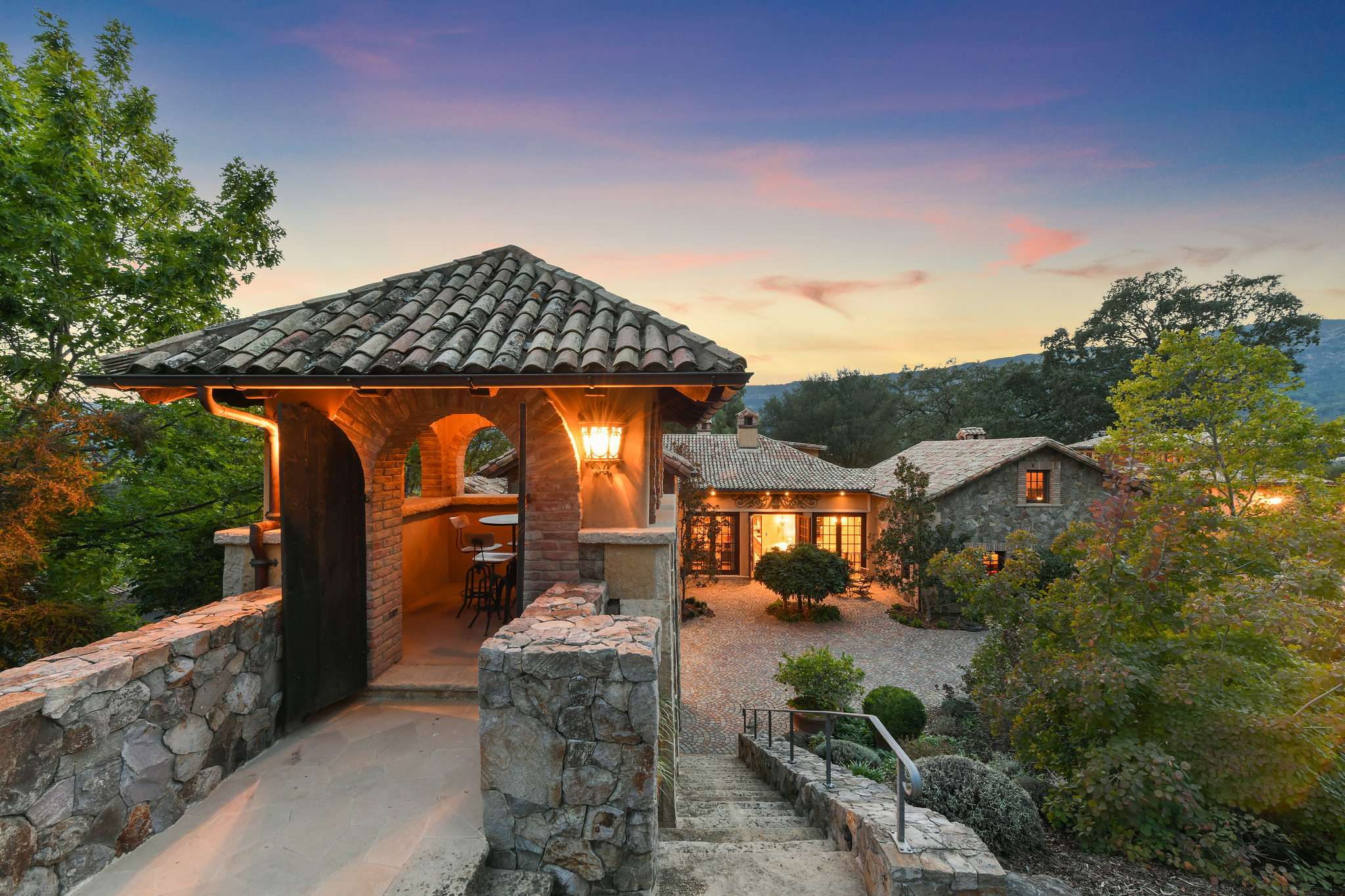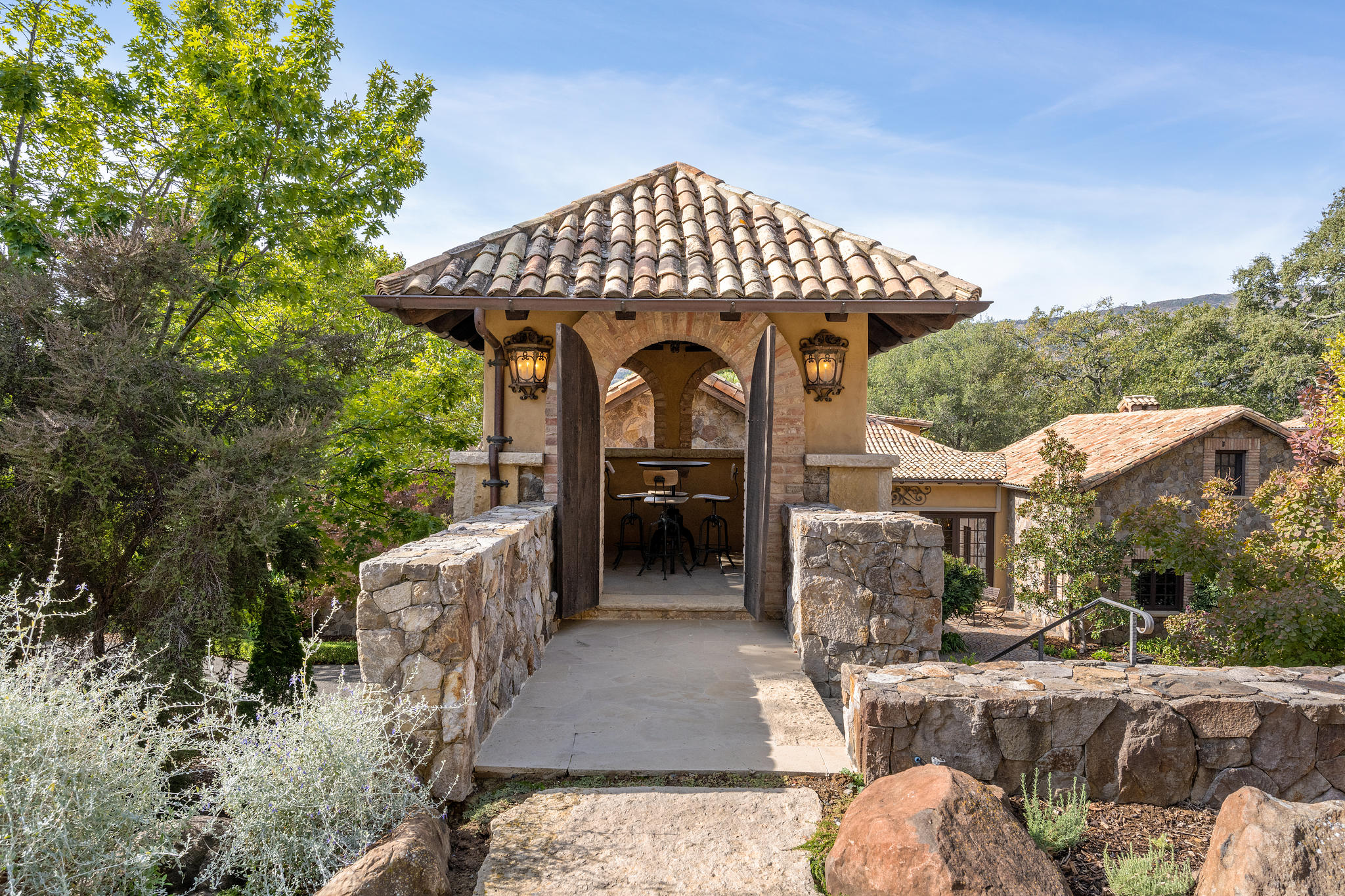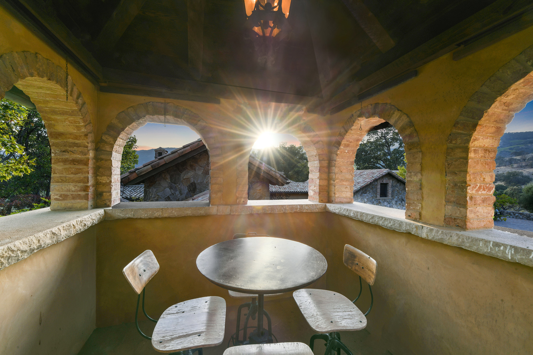 A hand-hewn wooden door opens to the chateau-style wine cellar on the main level of the tower; custom racking accommodates approximately 1,500 bottles and could be expanded into the hillside; an all-stone outside staircase leads up to the tasting room with arched openings on three sides looking out to the views