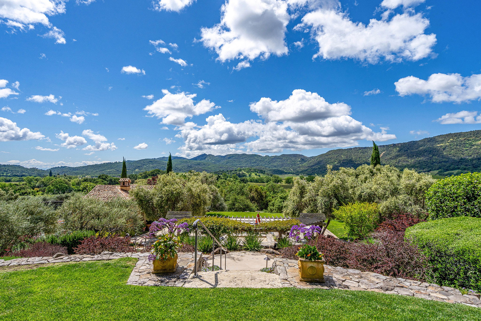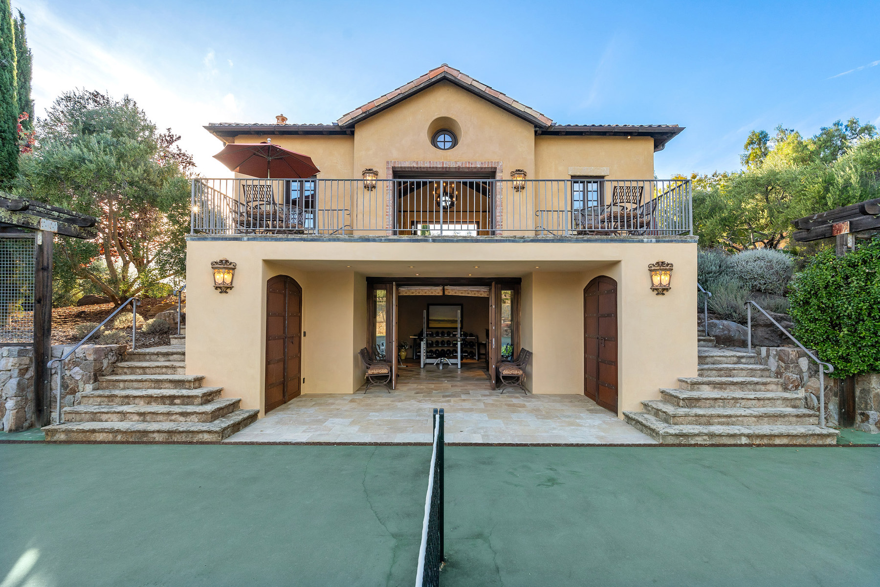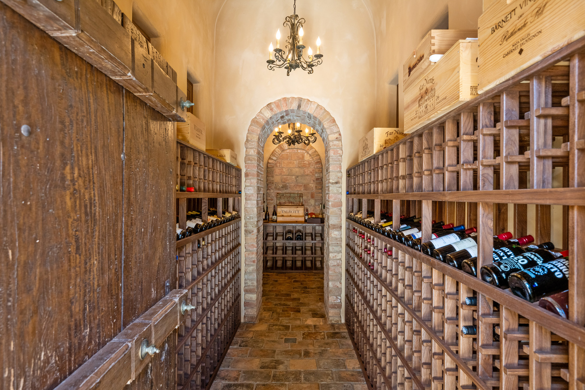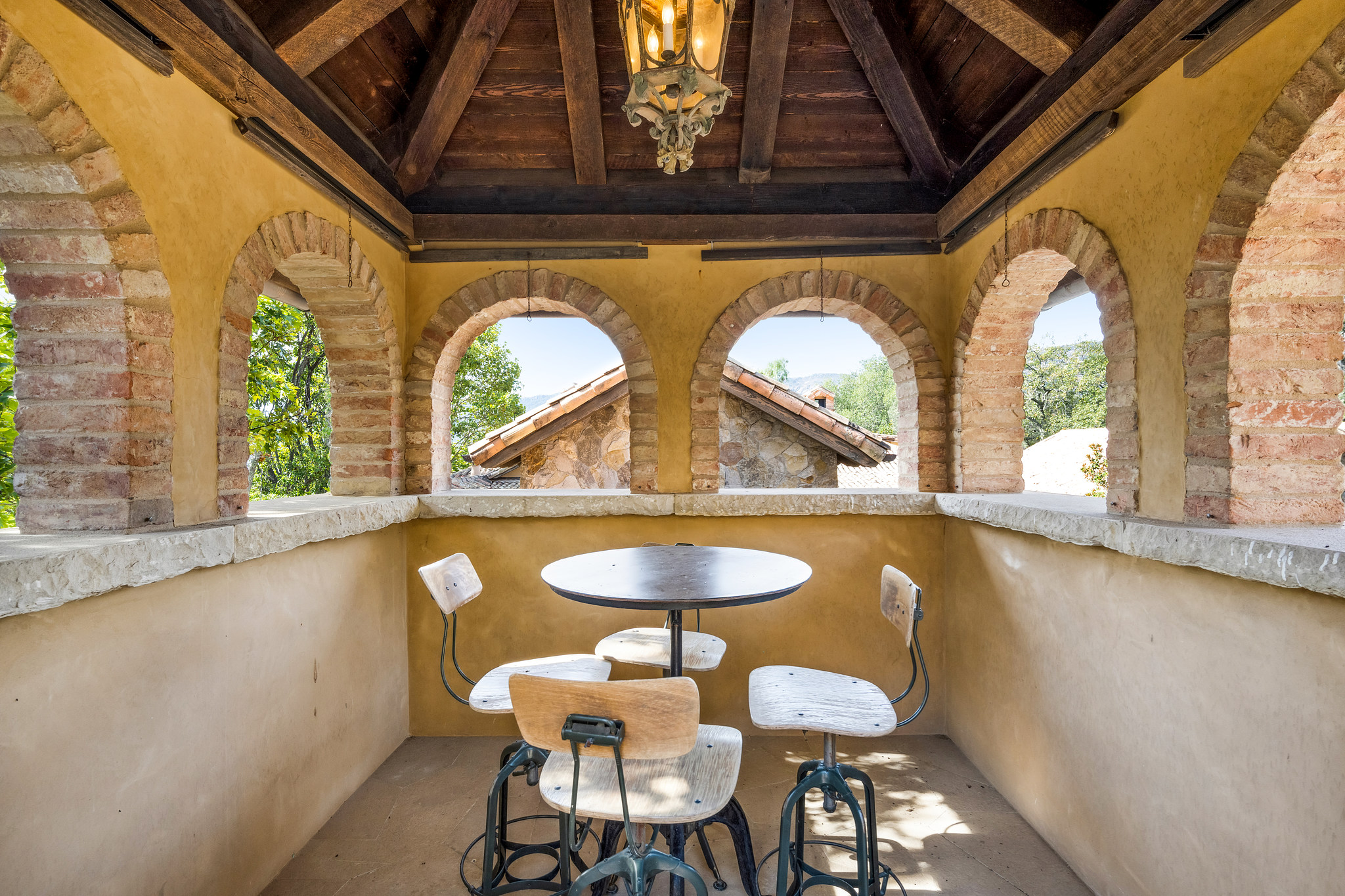 A hand-hewn wooden door opens to the chateau-style wine cellar on the main level of the tower; custom racking accommodates approximately 1,500 bottles and could be expanded into the hillside; an all-stone outside staircase leads up to the tasting room with arched openings on three sides looking out to the views