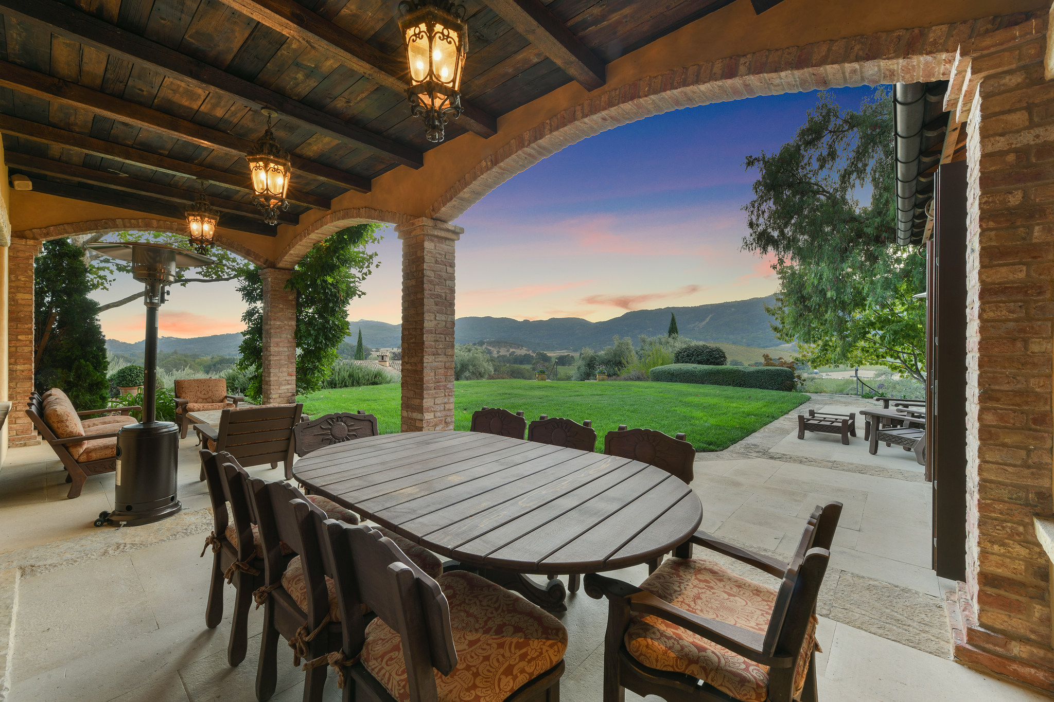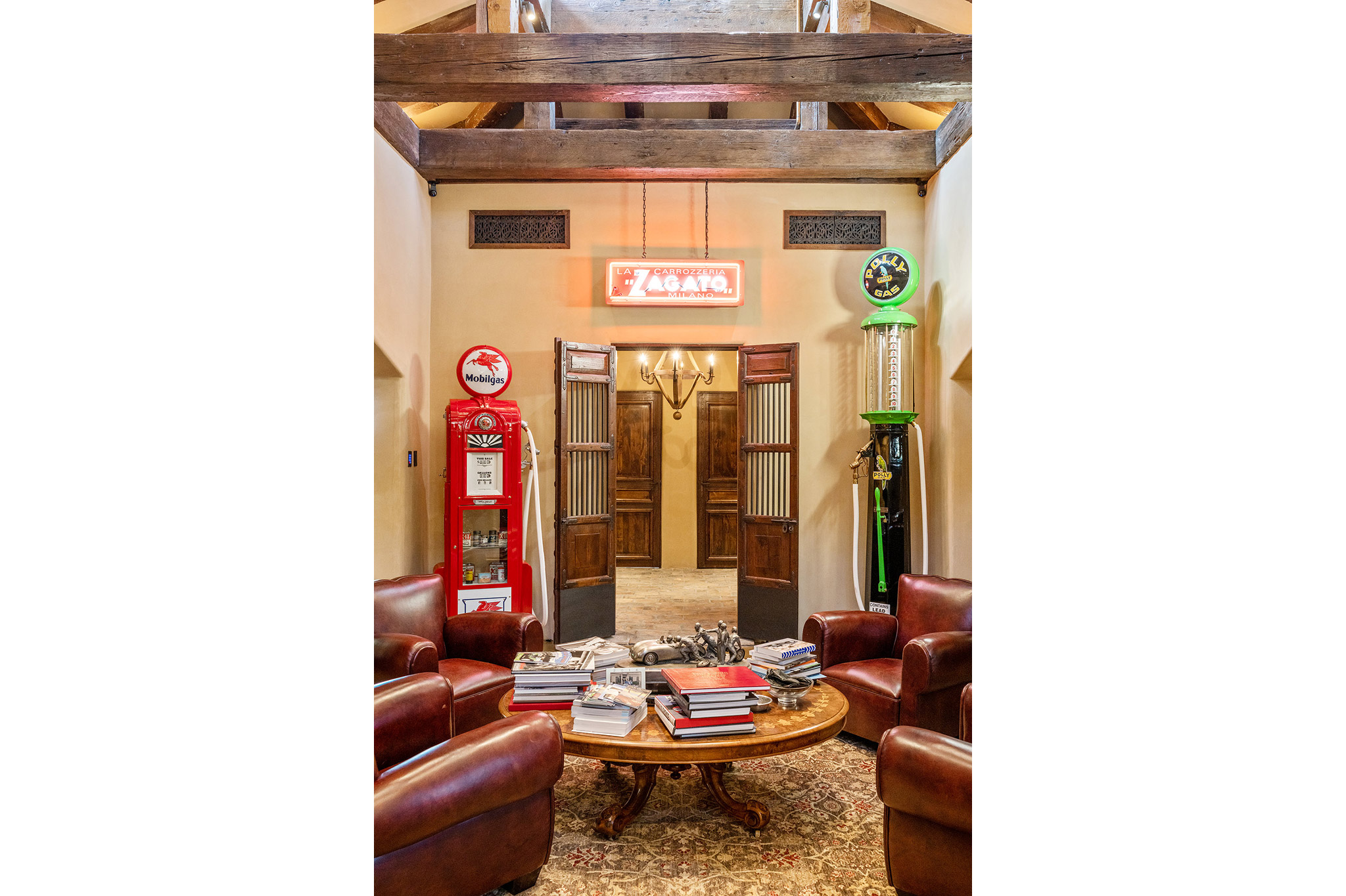 10-car/entertainment pavilion features an elongated window-lined cupola with beams and trusses spanning the ceiling above stained cement tile flooring; 3 chandeliers made from wine barrels hang in the cupola; separate office/catering area with granite counters, copper sink, and half-bath;3 carriage-style doors open to the motor court