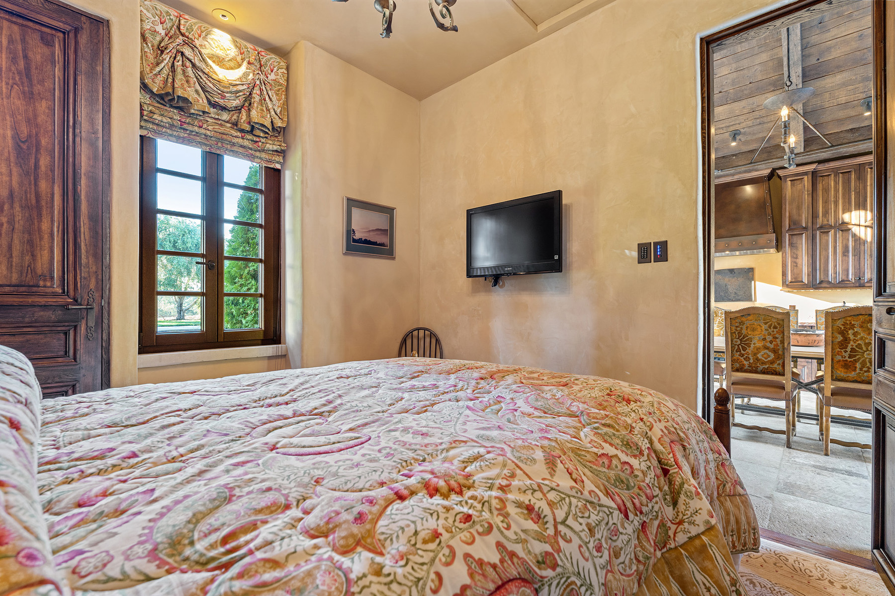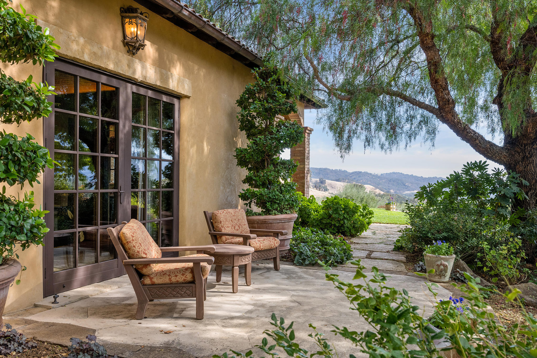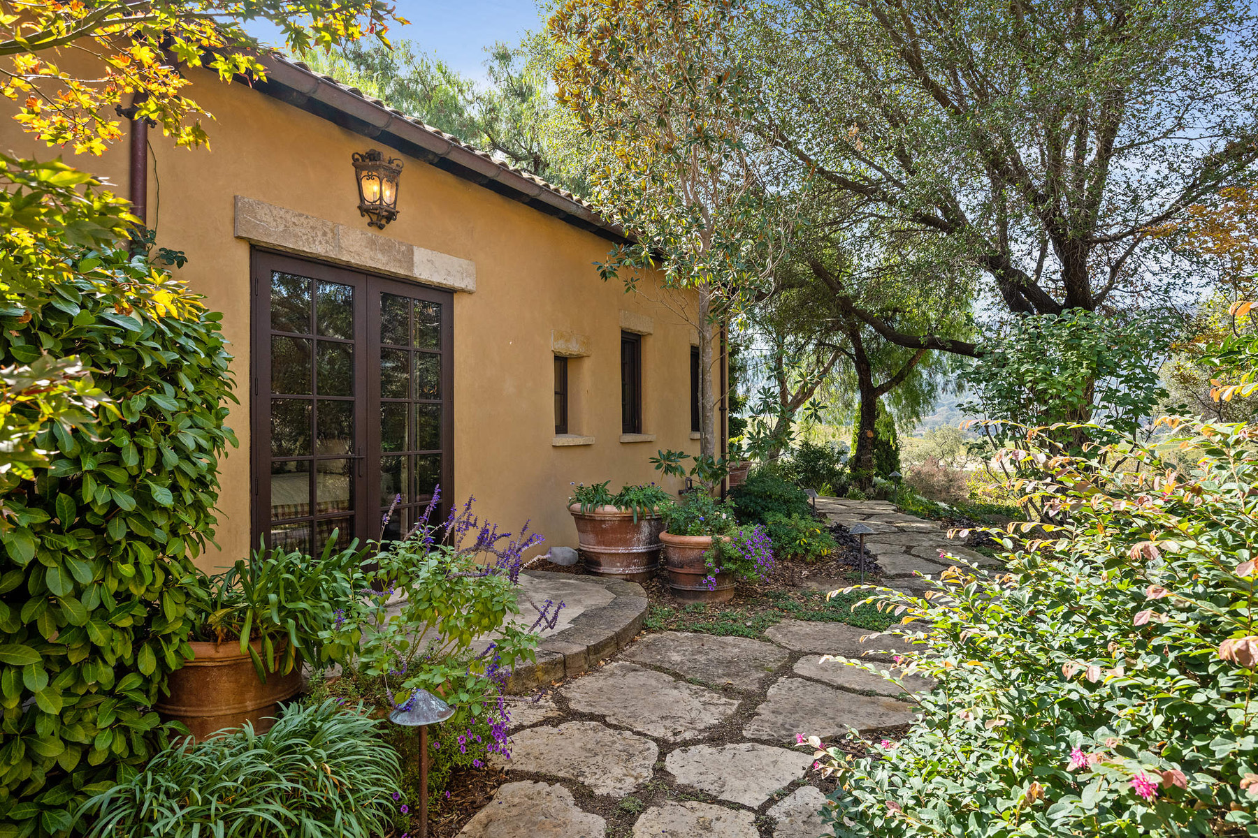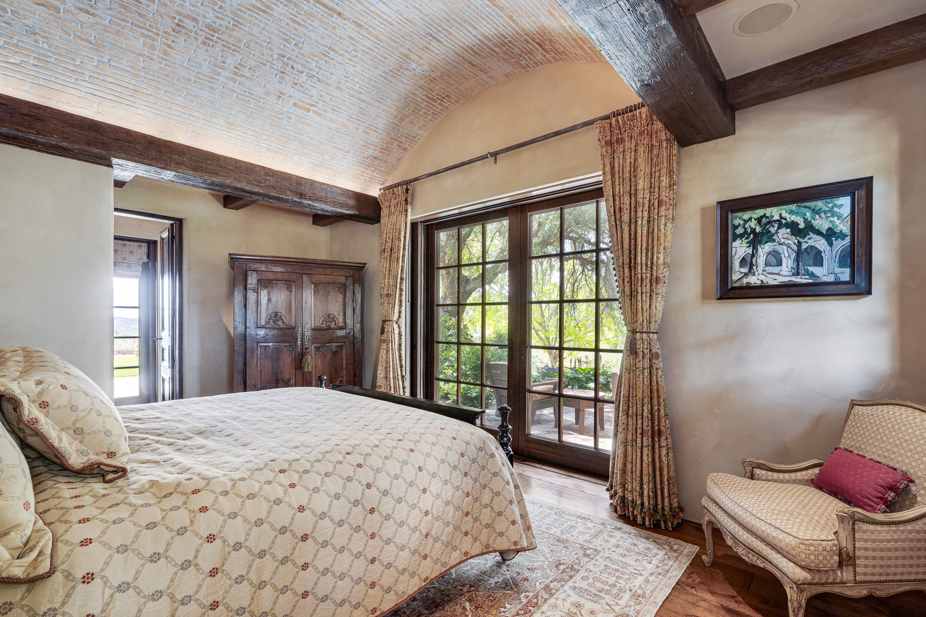 Junior primary suite has a hand painted, barrel-vaulted ceiling, French doors to a private vineyard view patio, and natural stone en suite bath with frameless-glass shower and French door to a second patio