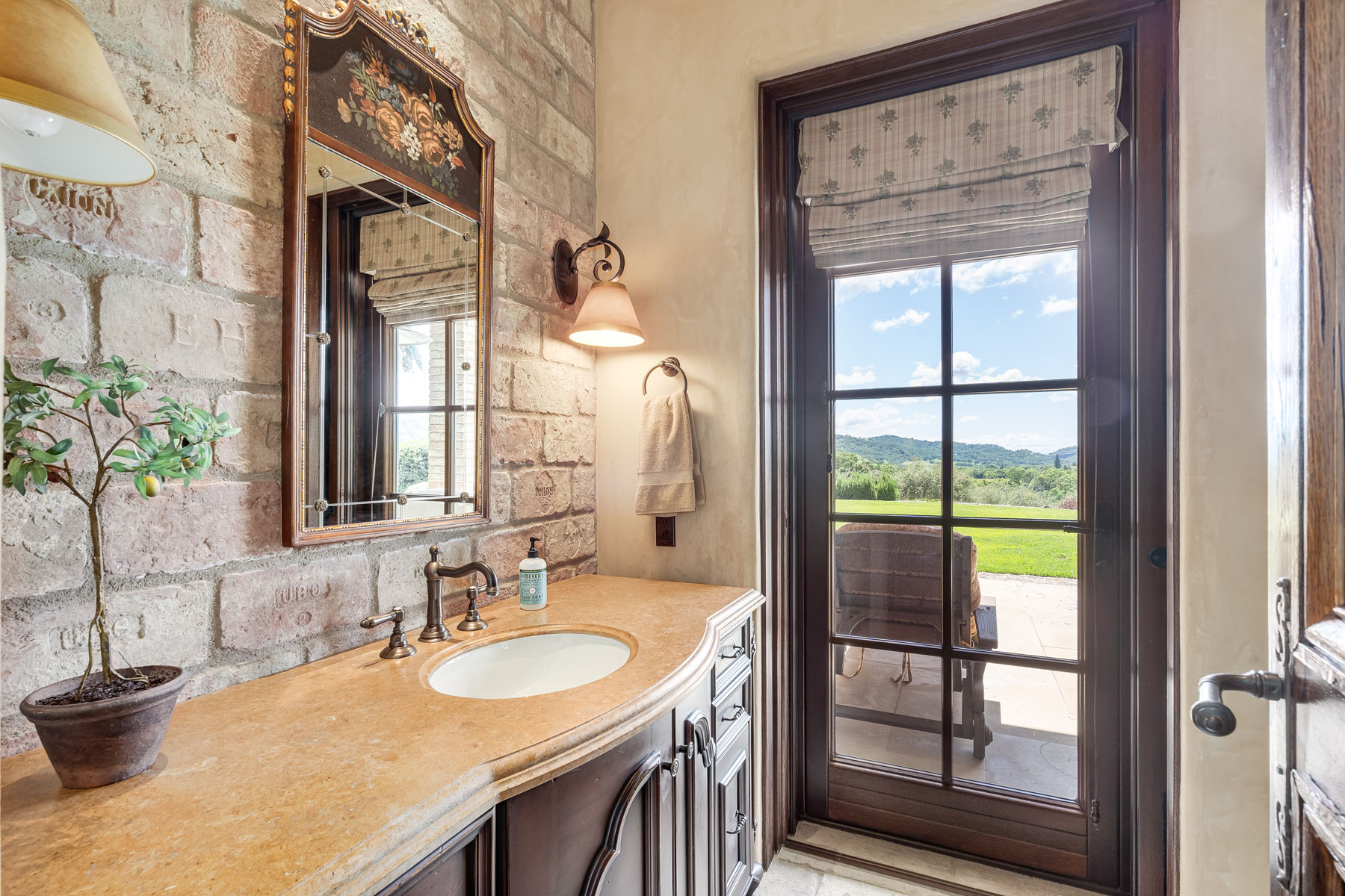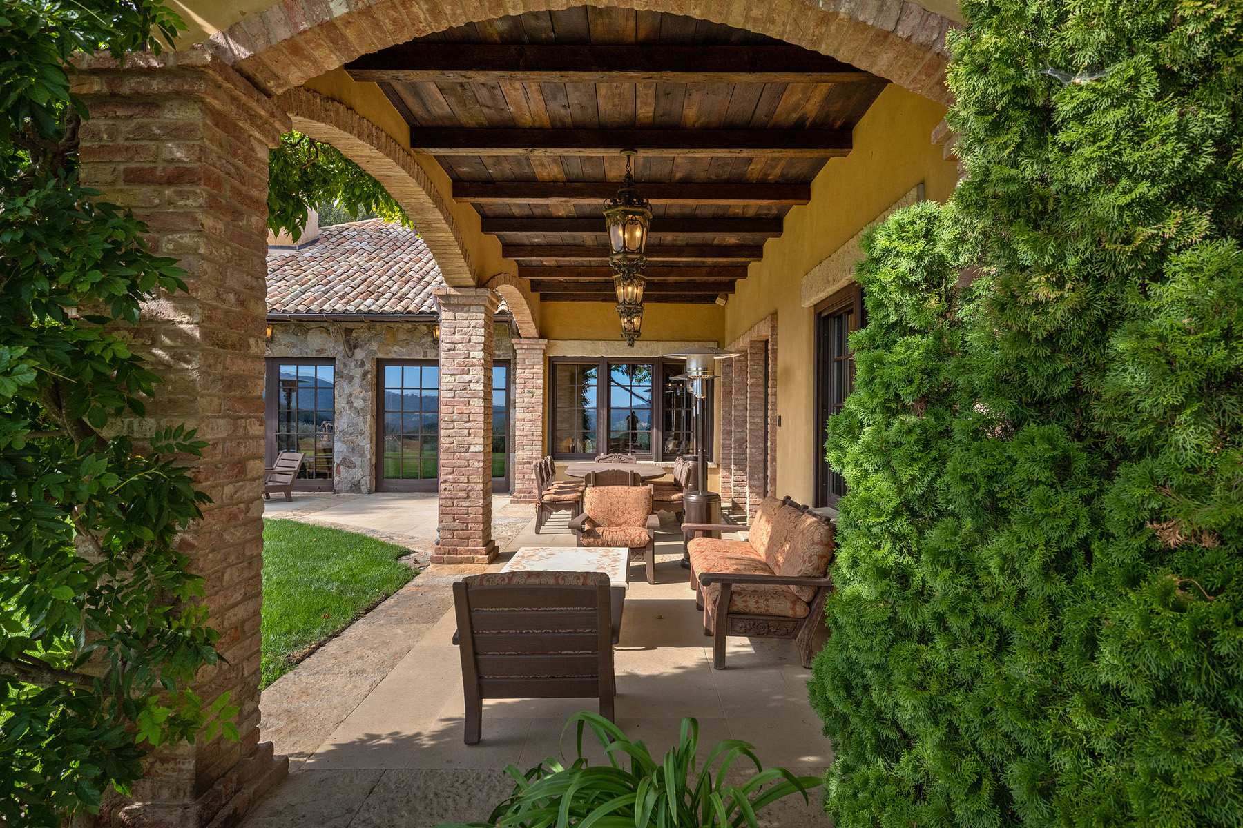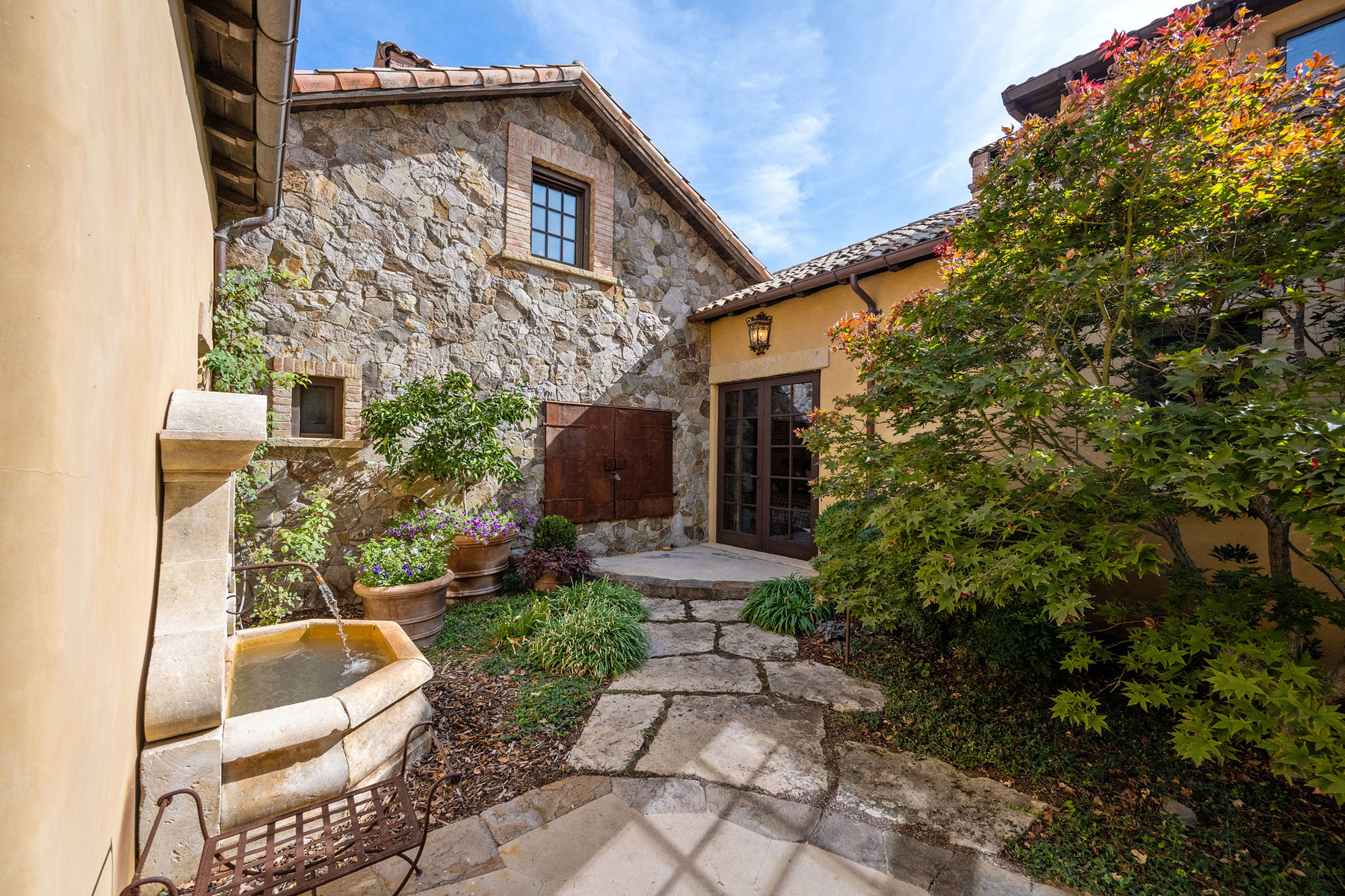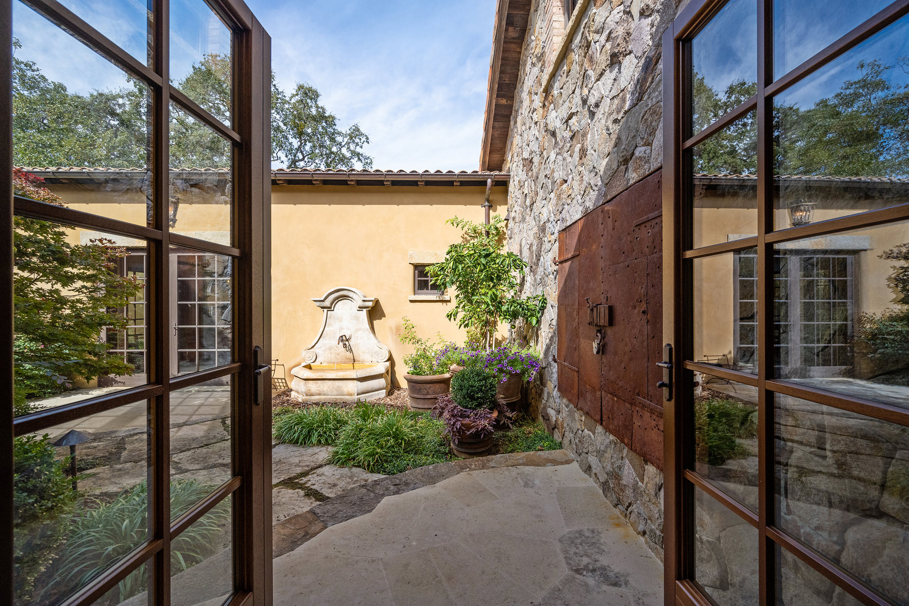 Junior primary suite has a hand painted, barrel-vaulted ceiling, French doors to a private vineyard view patio, and natural stone en suite bath with frameless-glass shower and French door to a second patio