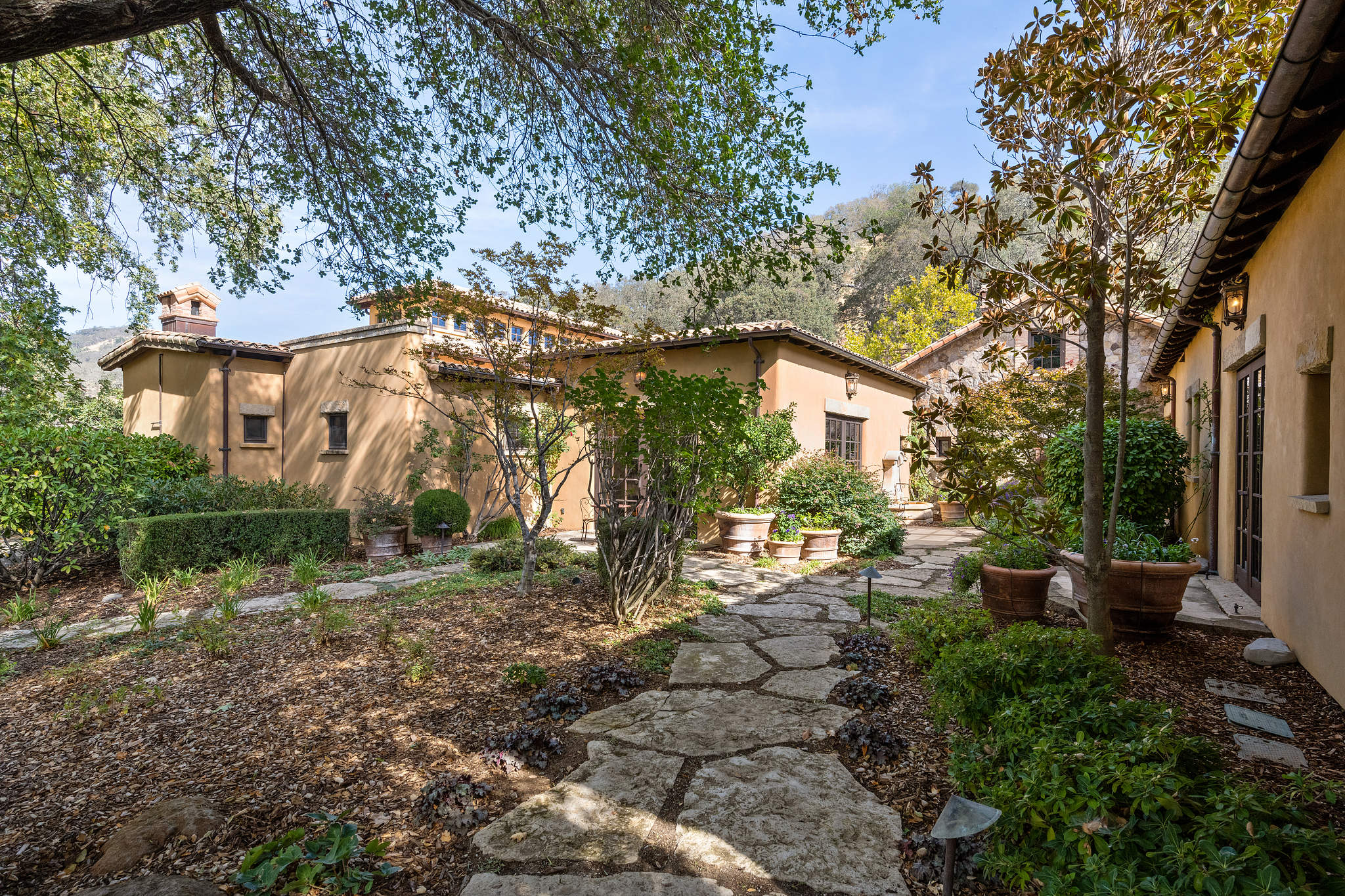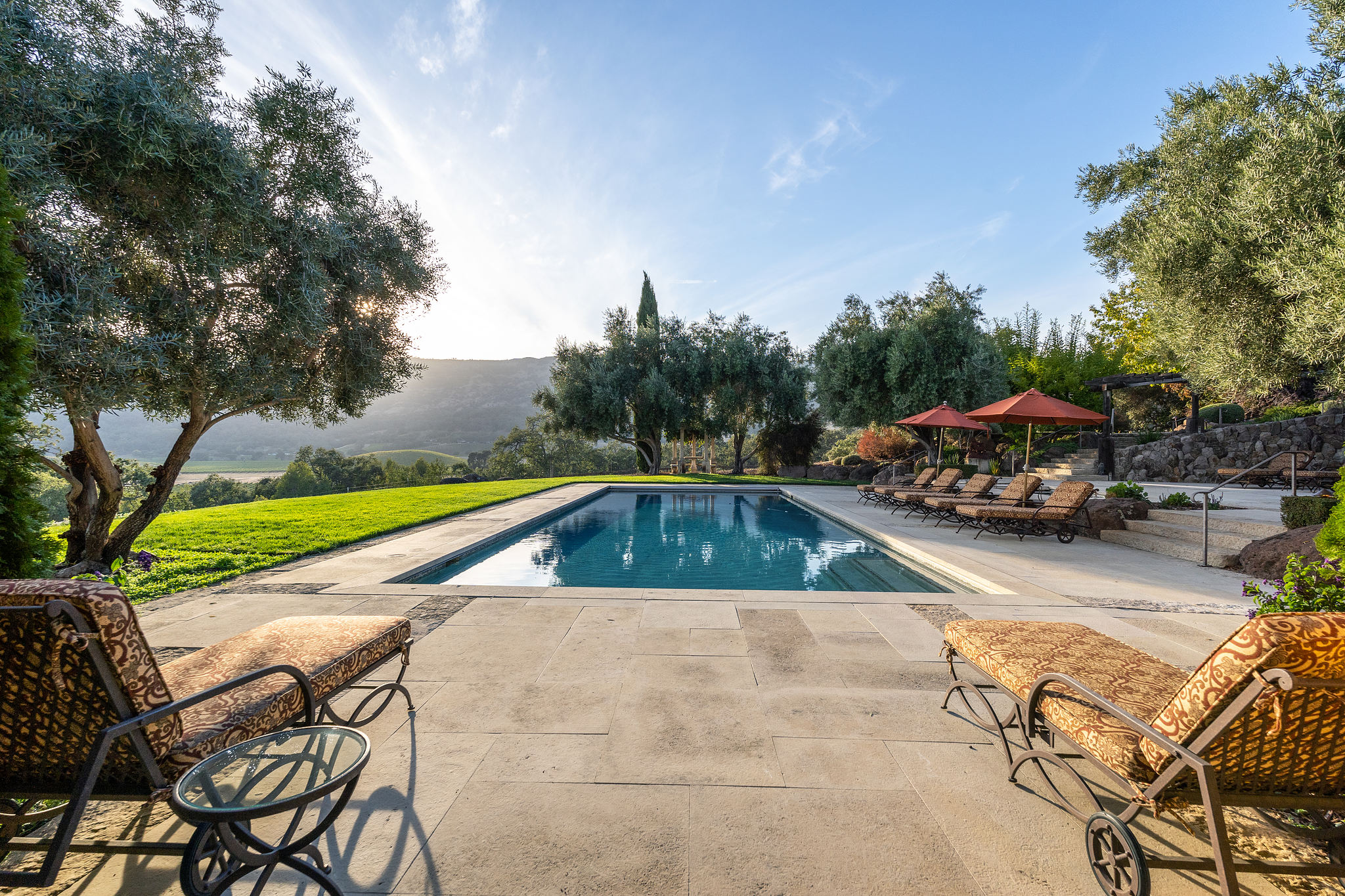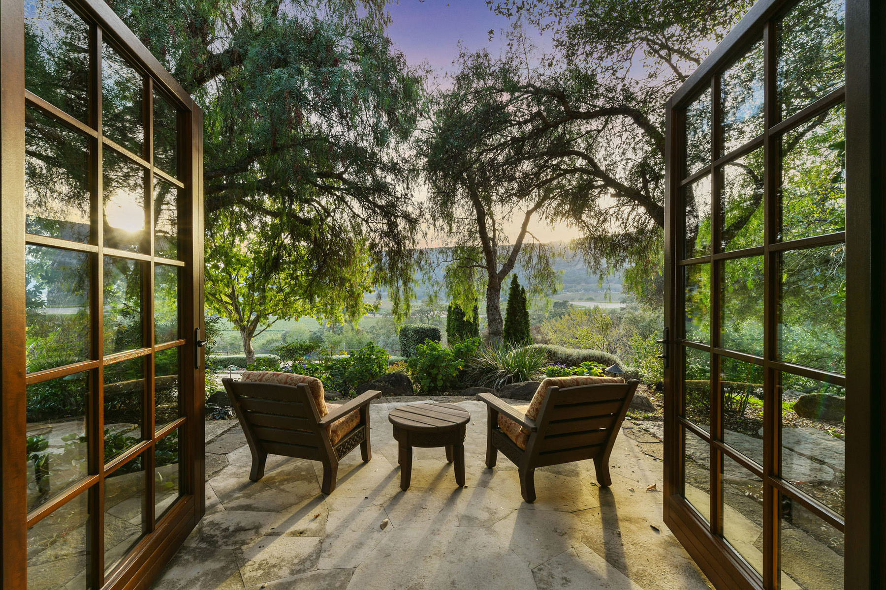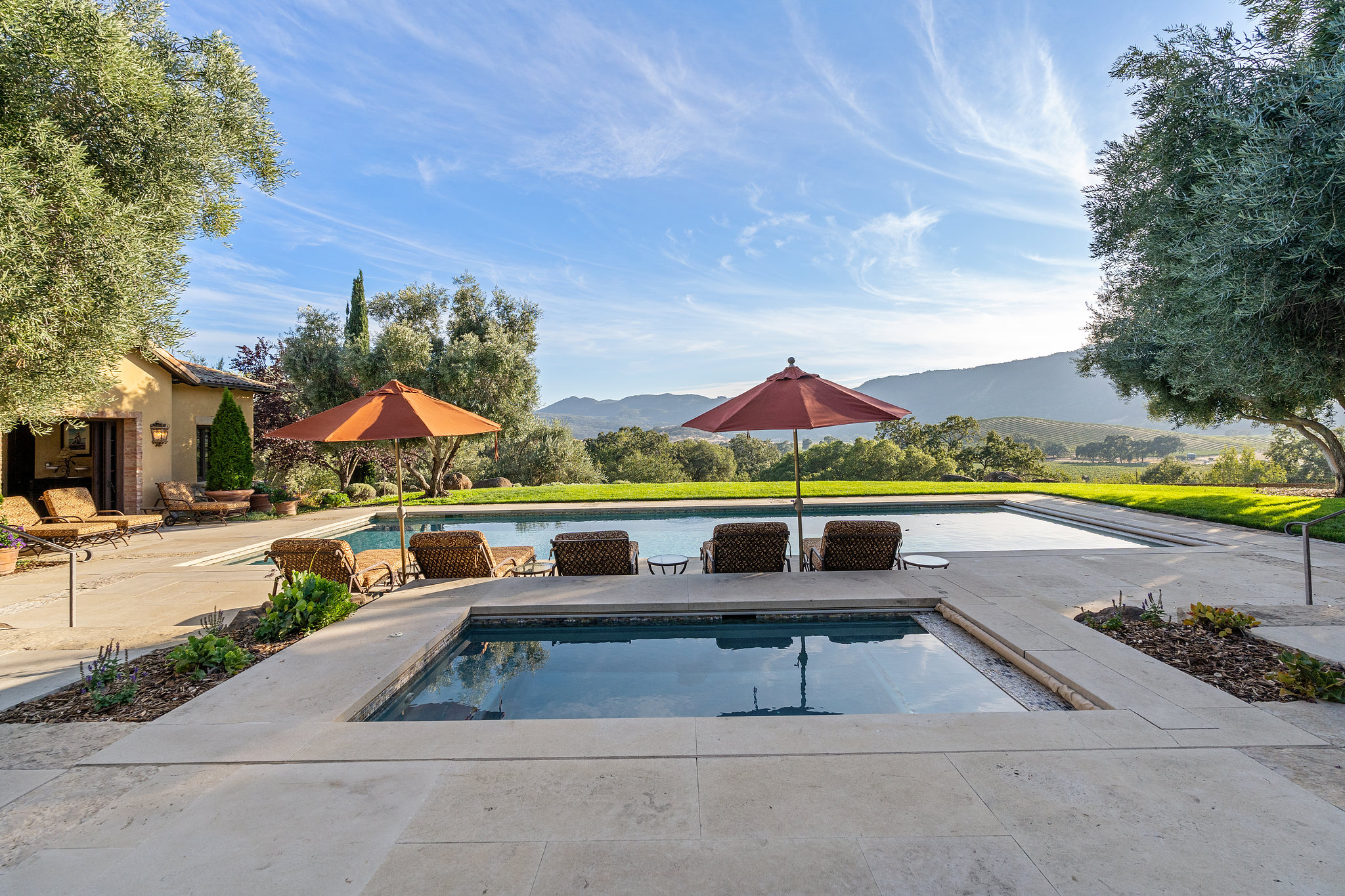 Junior primary suite has a hand painted, barrel-vaulted ceiling, French doors to a private vineyard view patio, and natural stone en suite bath with frameless-glass shower and French door to a second patio