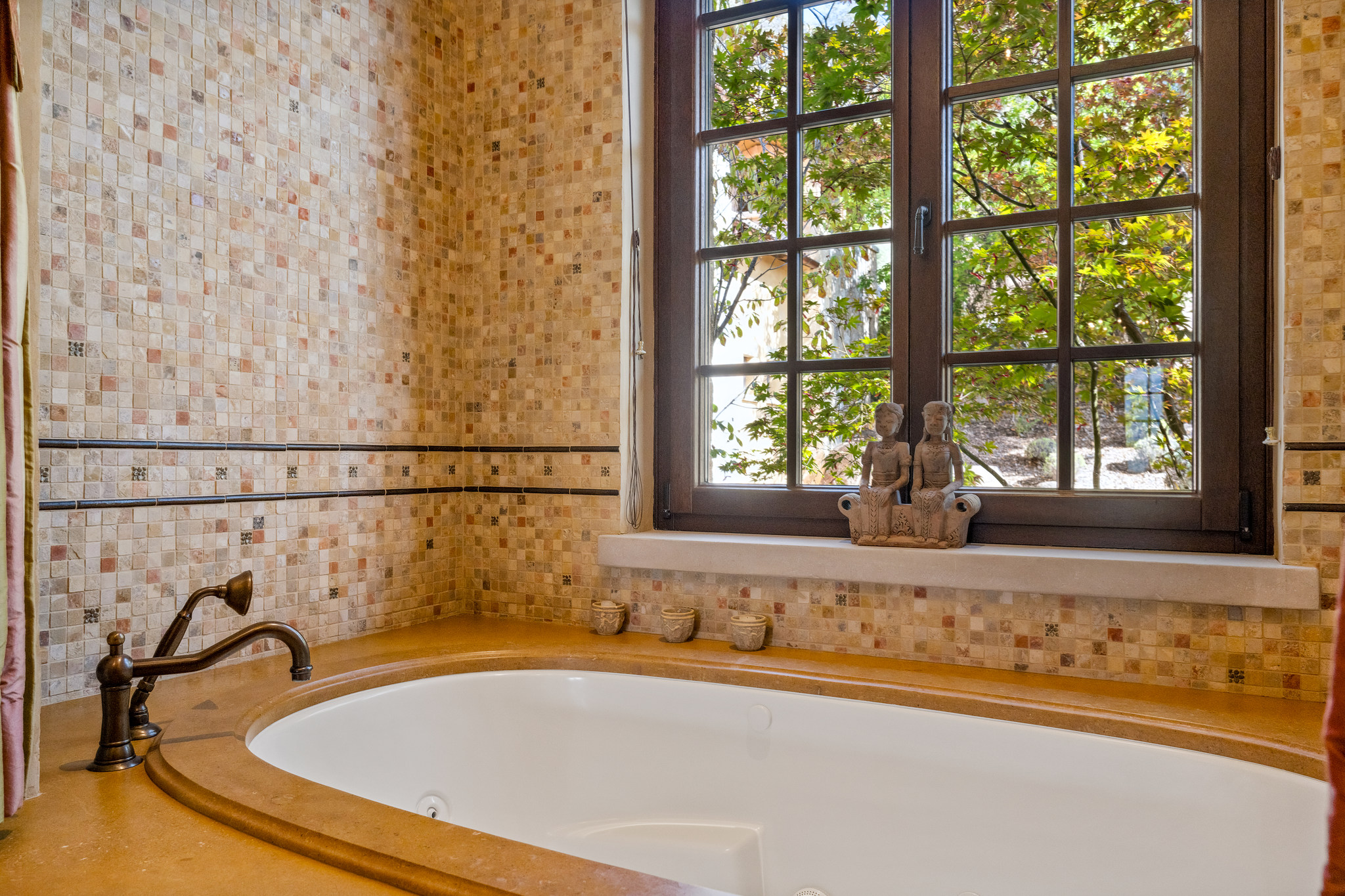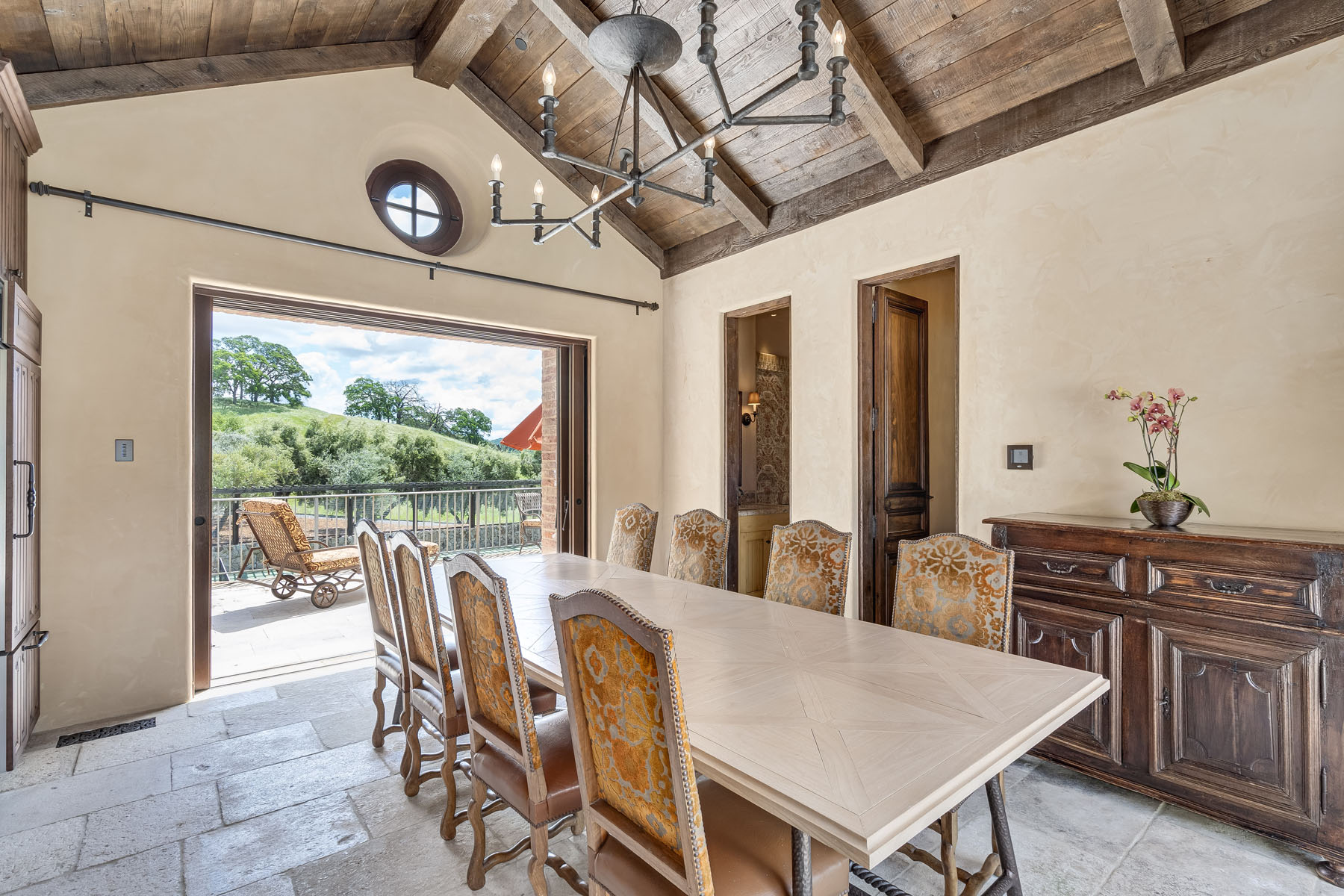 Double-door entrance to the primary bedroom suite with beamed ceiling and chandelier, double sliding glass doors to a view terrace with recessed spa, and two fully customized walk-in closets; en suite bath with floor in thick blocks of natural limestone, limestone slab surfaces, solid stone sink, and mosaic accents; jetted tub, large steam shower with rain and fixed sprays, and private commode room