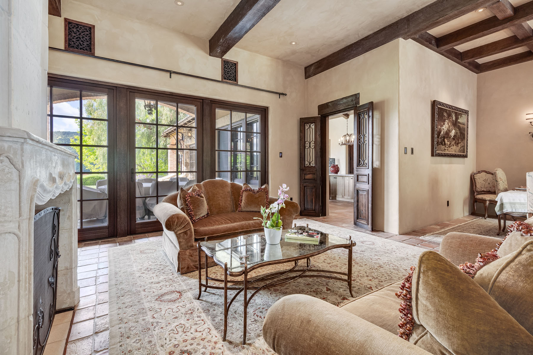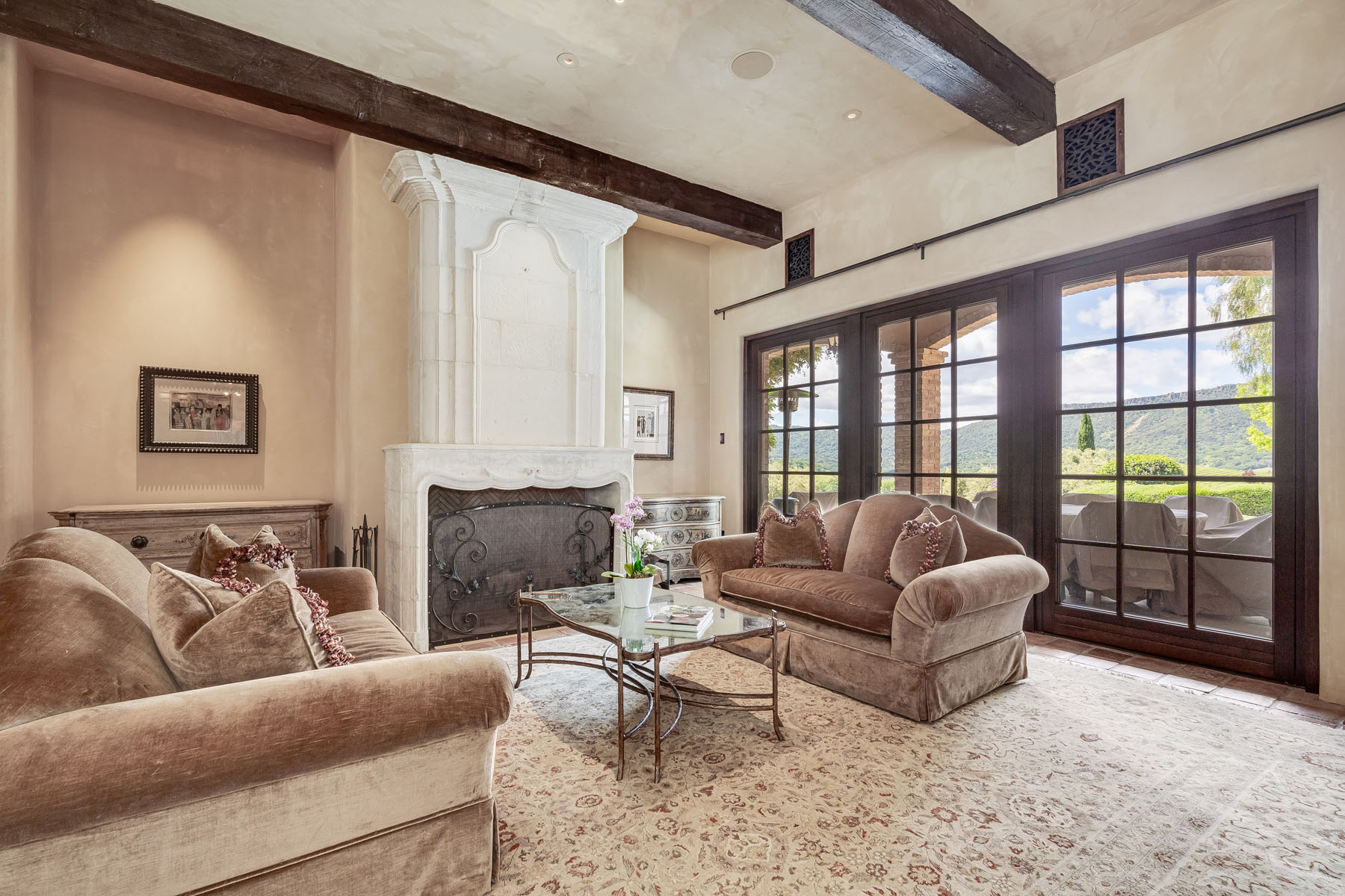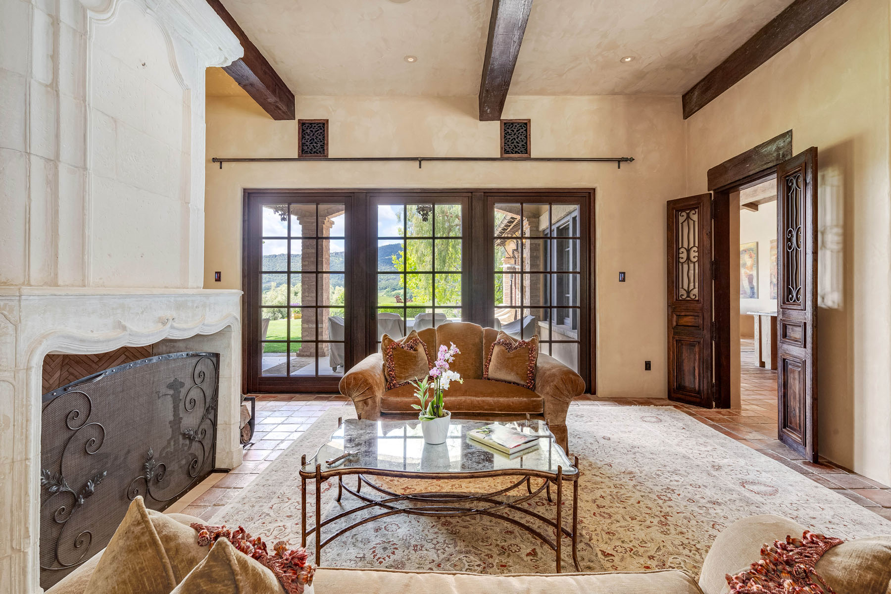 Formal living room with fireplace and towering carved stone mantelpiece from France; French door and matching windows open to the loggia and views