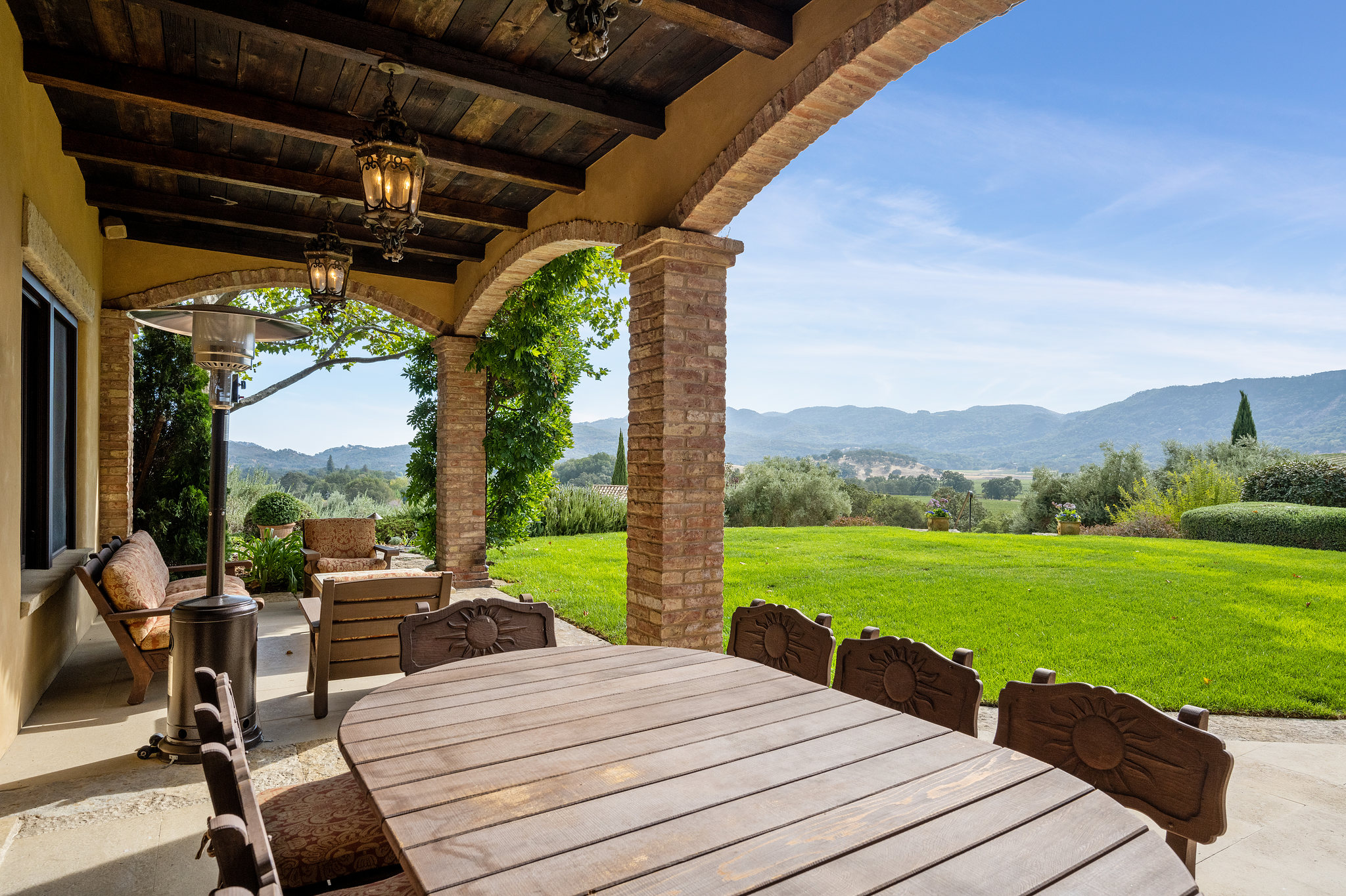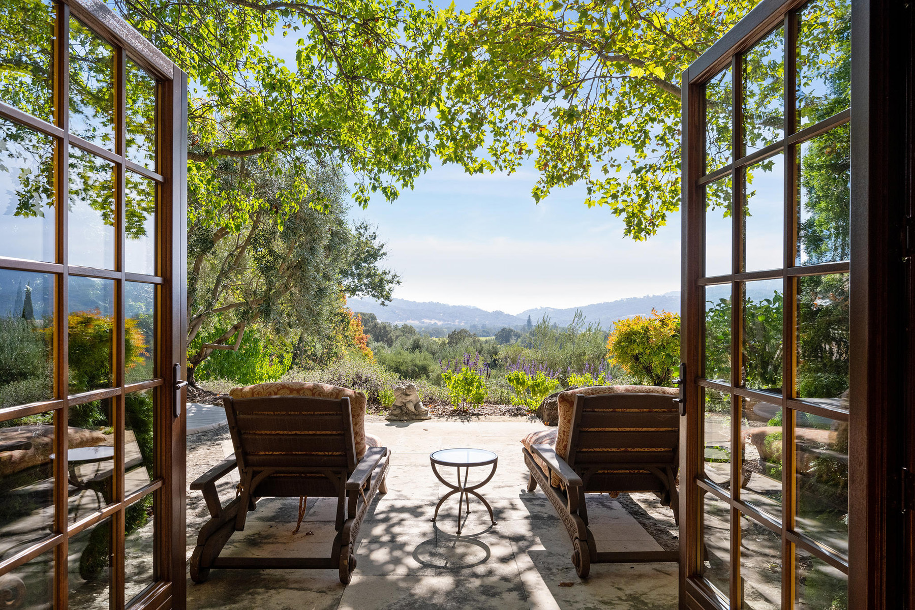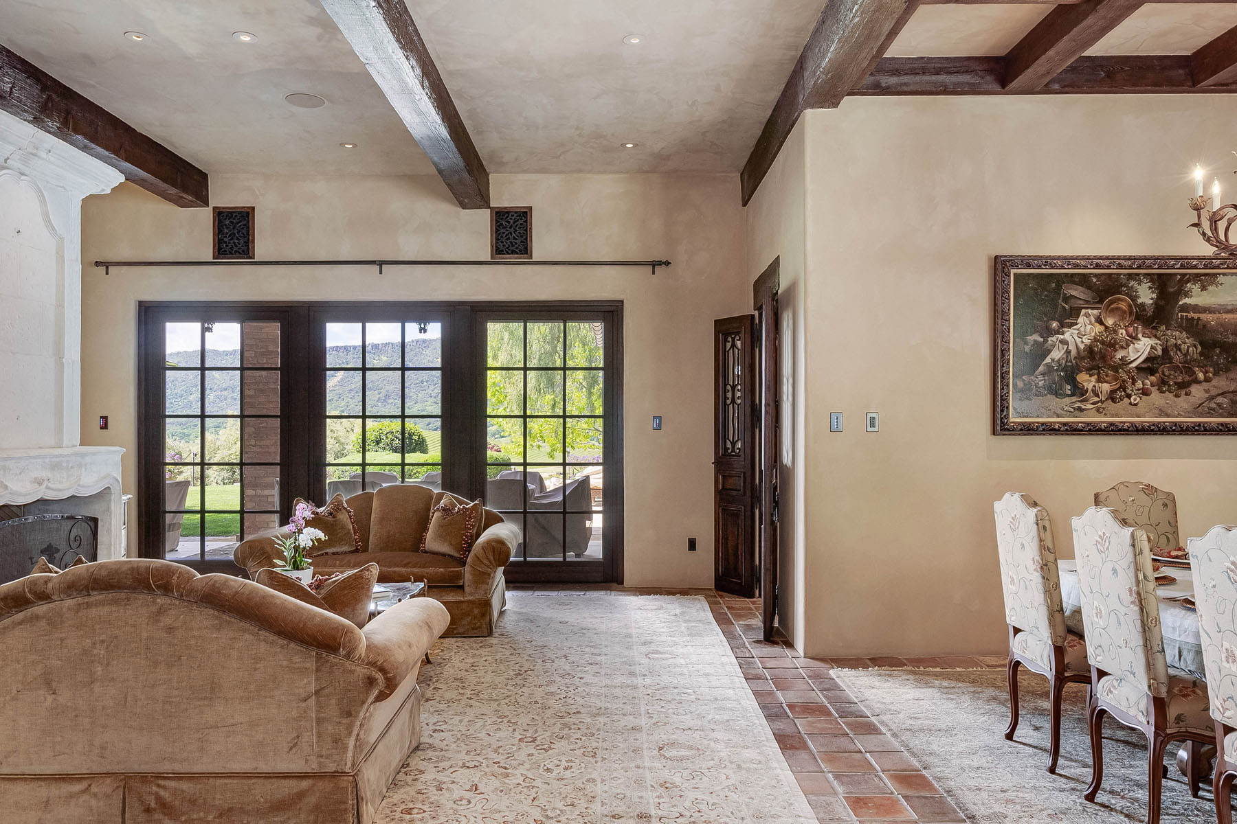 Formal living room with fireplace and towering carved stone mantelpiece from France; French door and matching windows open to the loggia and views