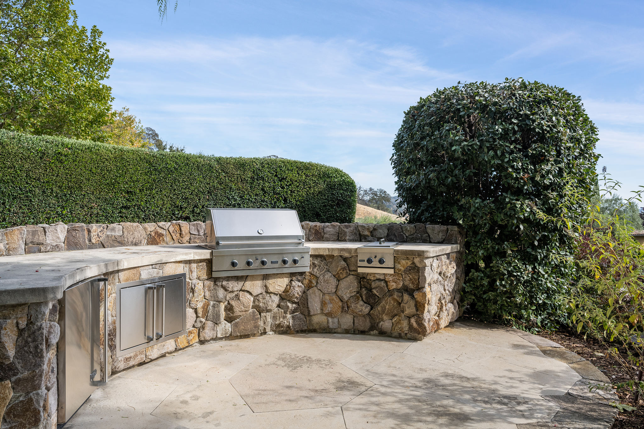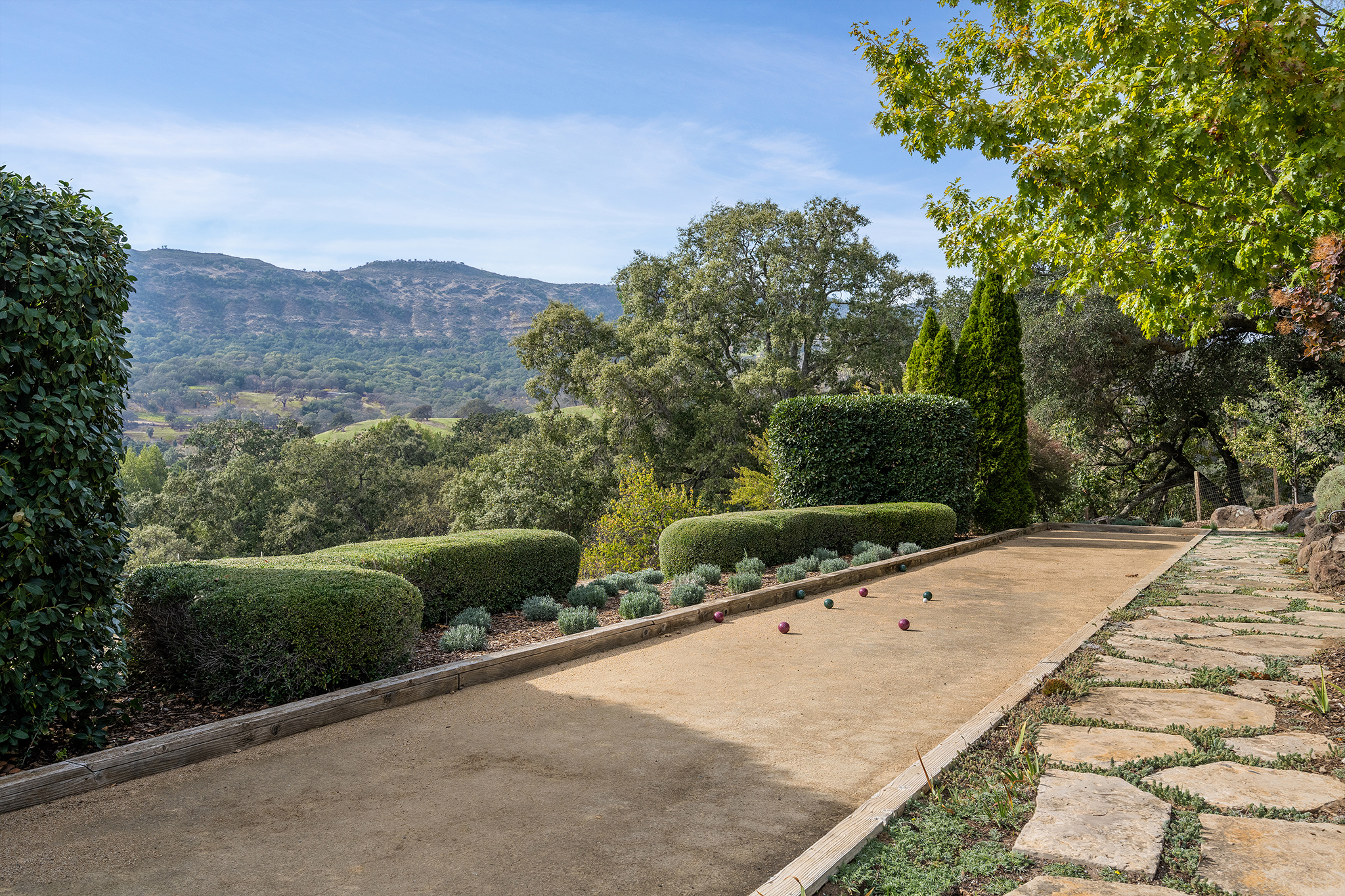 Step down from the lawn to the bocce court and outdoor barbecue center with including barbecue, gas burner, refrigerator, and expansive all-stone curved countertop