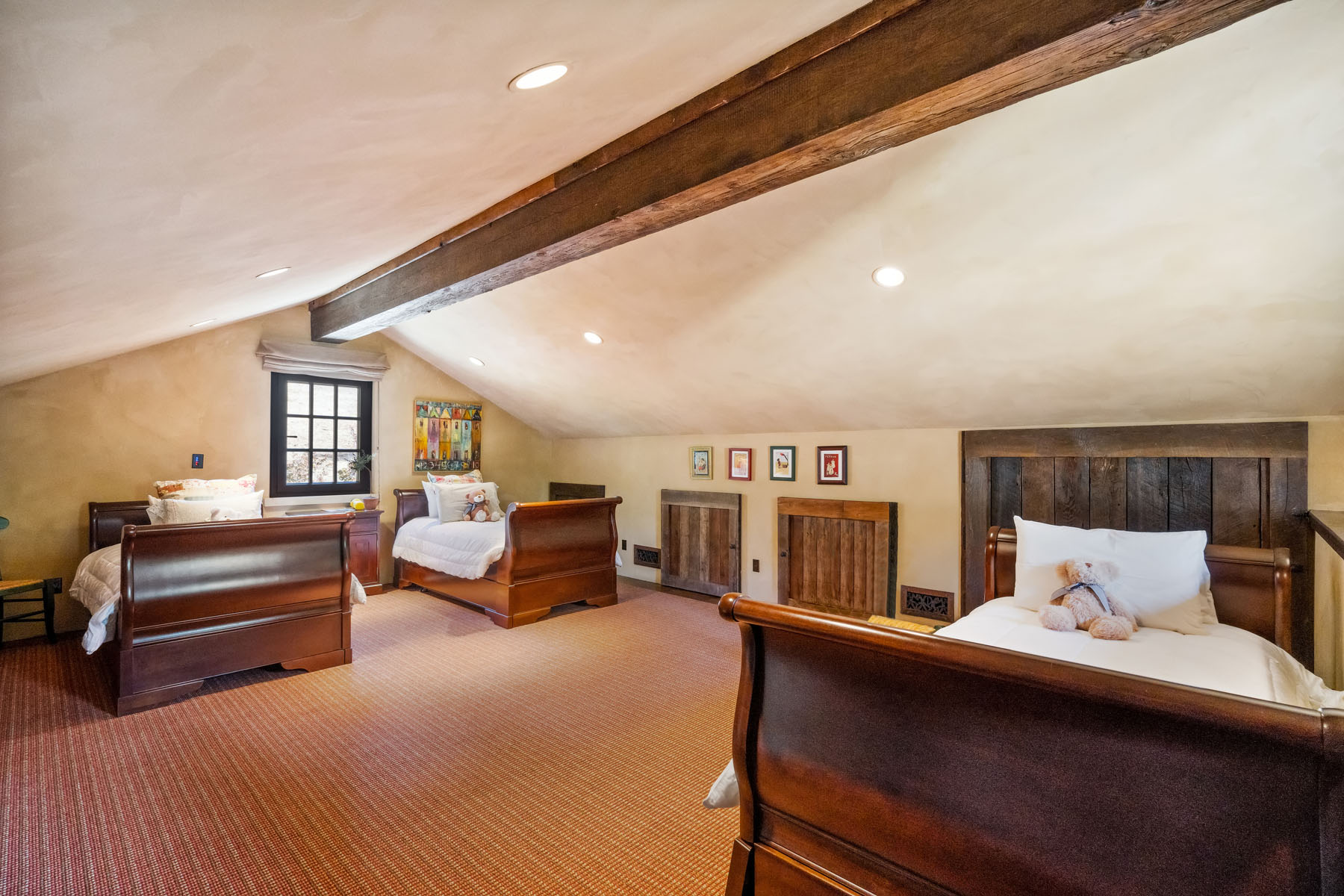Upstairs bunk room, accessed from the recreation room, has a cathedral beamed ceiling, carpeted floor, and numerous concealed storage areas