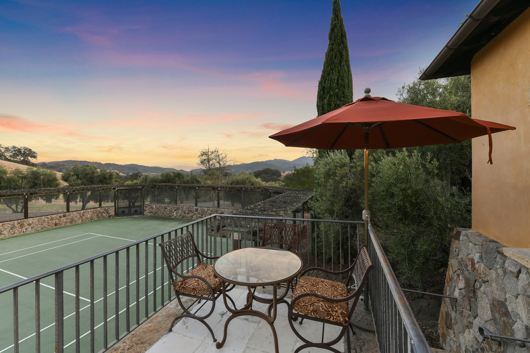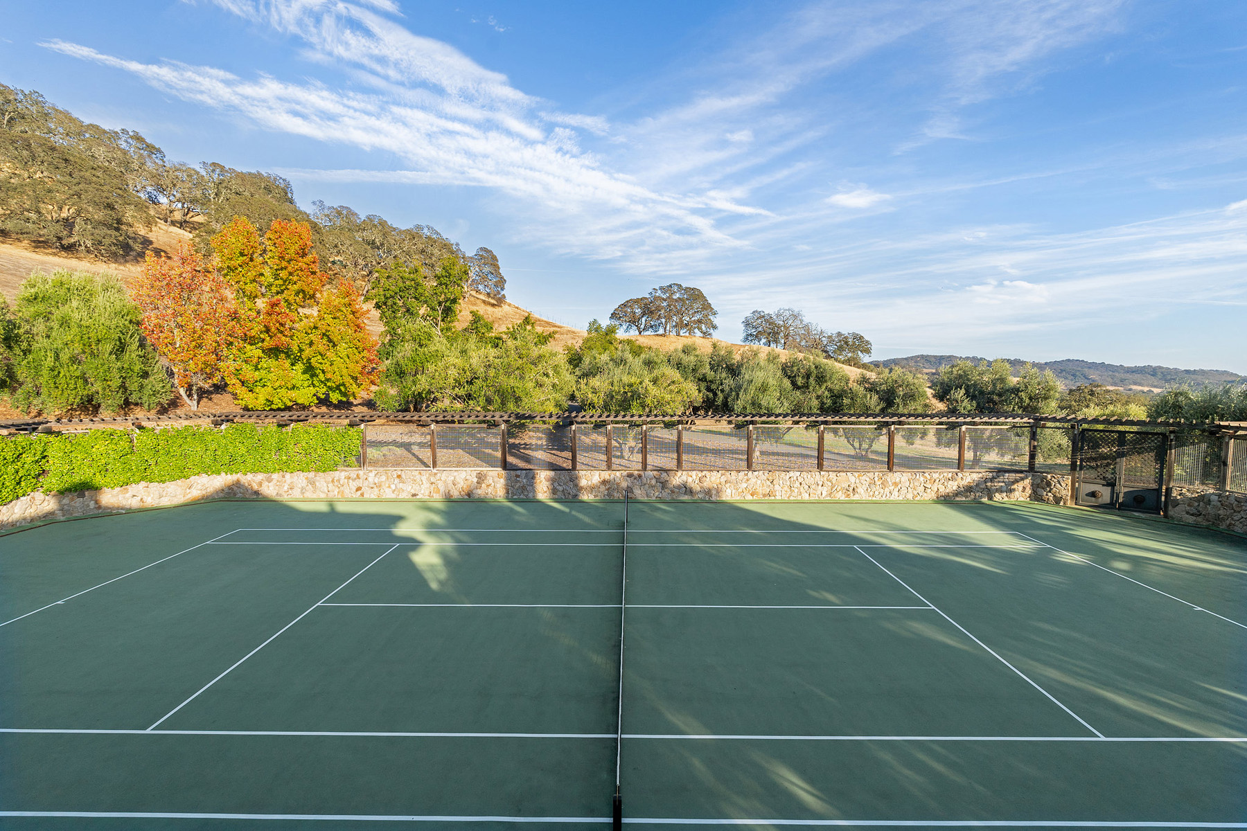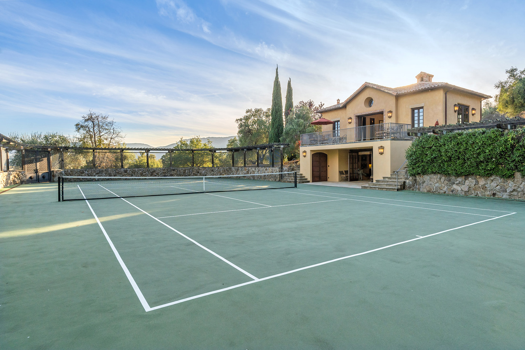 Tennis court with perimeter stone wall and fencing plus in-ground wiring for sound