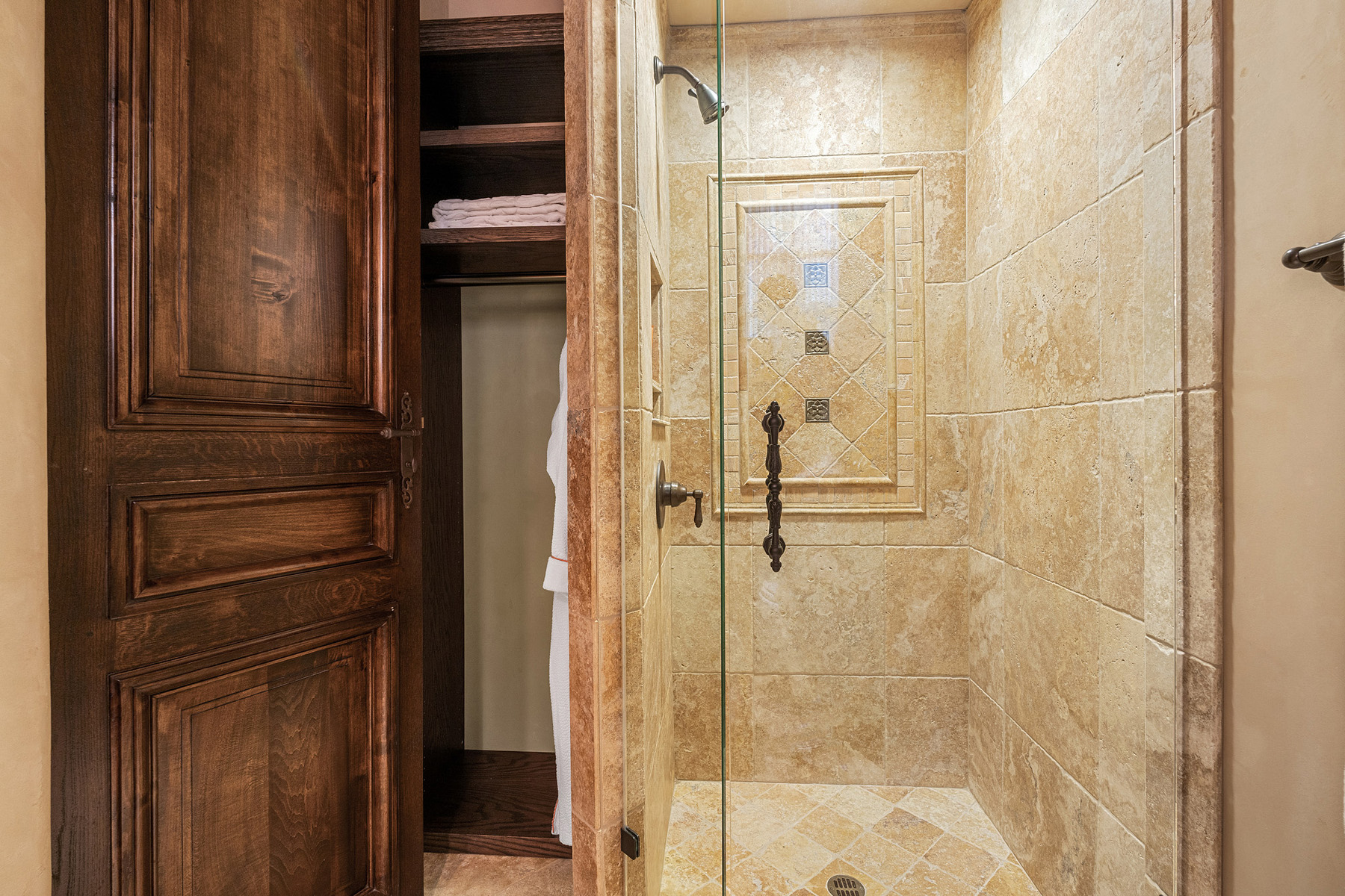 Bathroom, serving the recreation, bunk, and pool table rooms, in all-marble with elaborate mosaic inlay in the frameless-glass shower