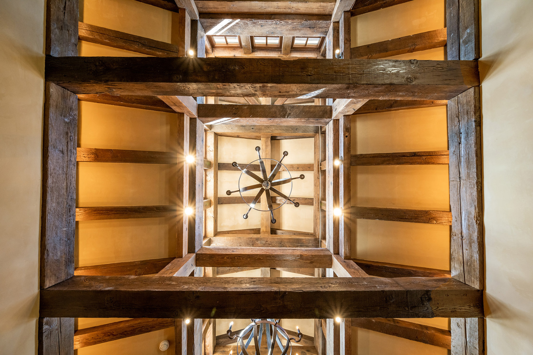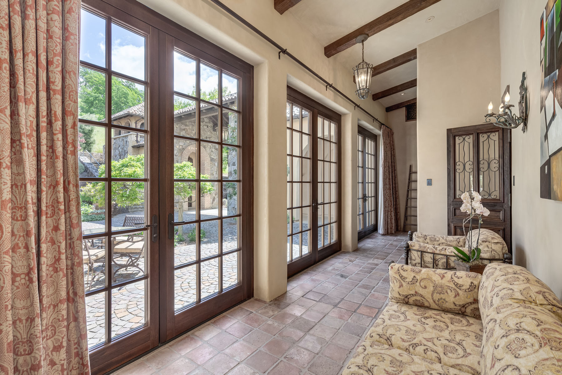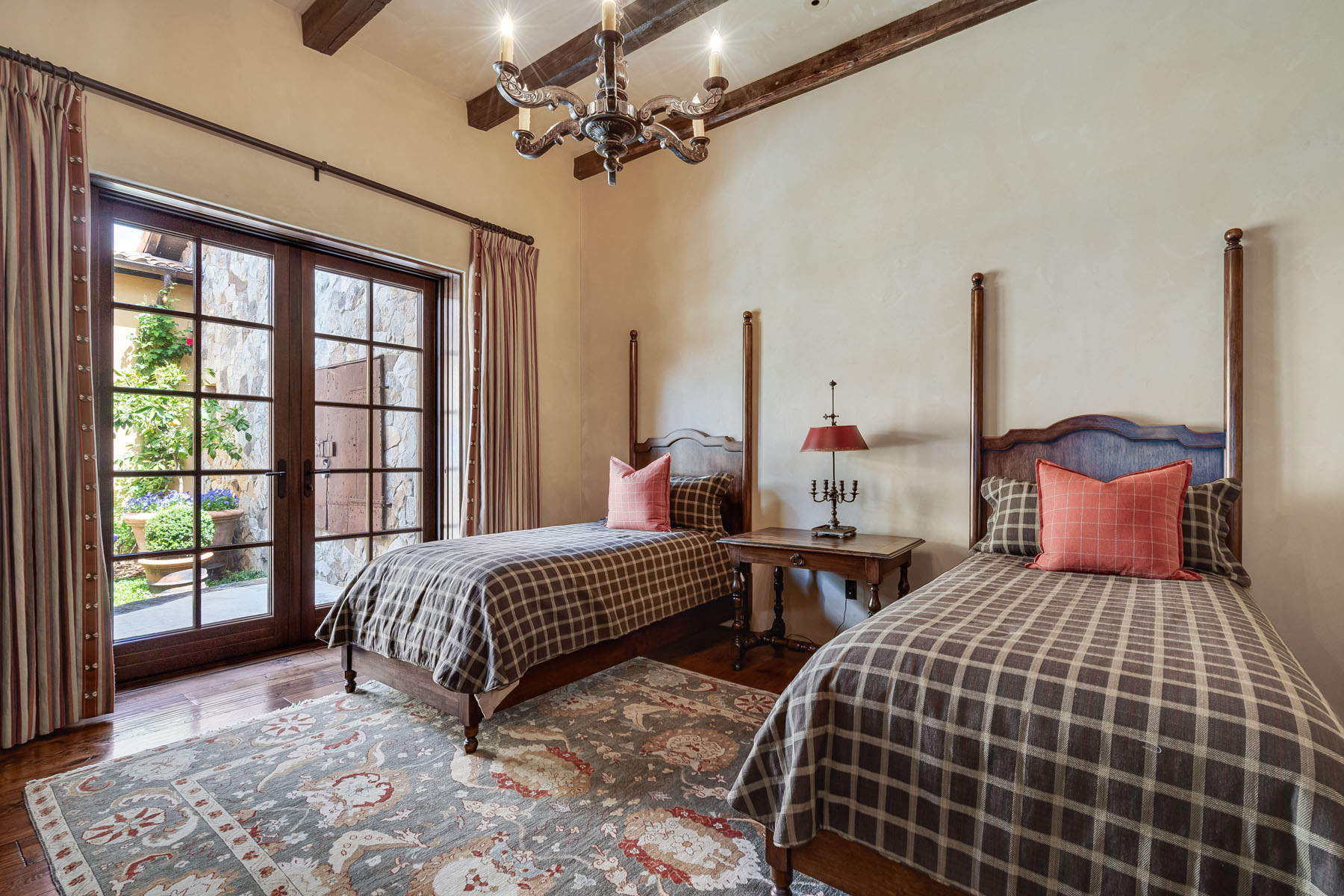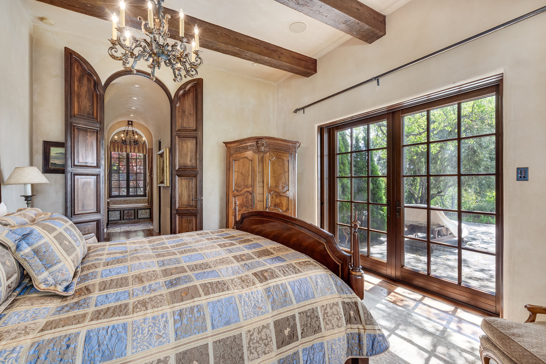 Two bedroom suites off a private hallway with towering ceiling and clerestory windows and oval transoms above each entrance door; each bedroom includes a beamed ceiling and chandelier, French doors to a patio, and stunning uniquely appointed en suite bath (one with tub and overhead shower and one with fossilized limestone shower)