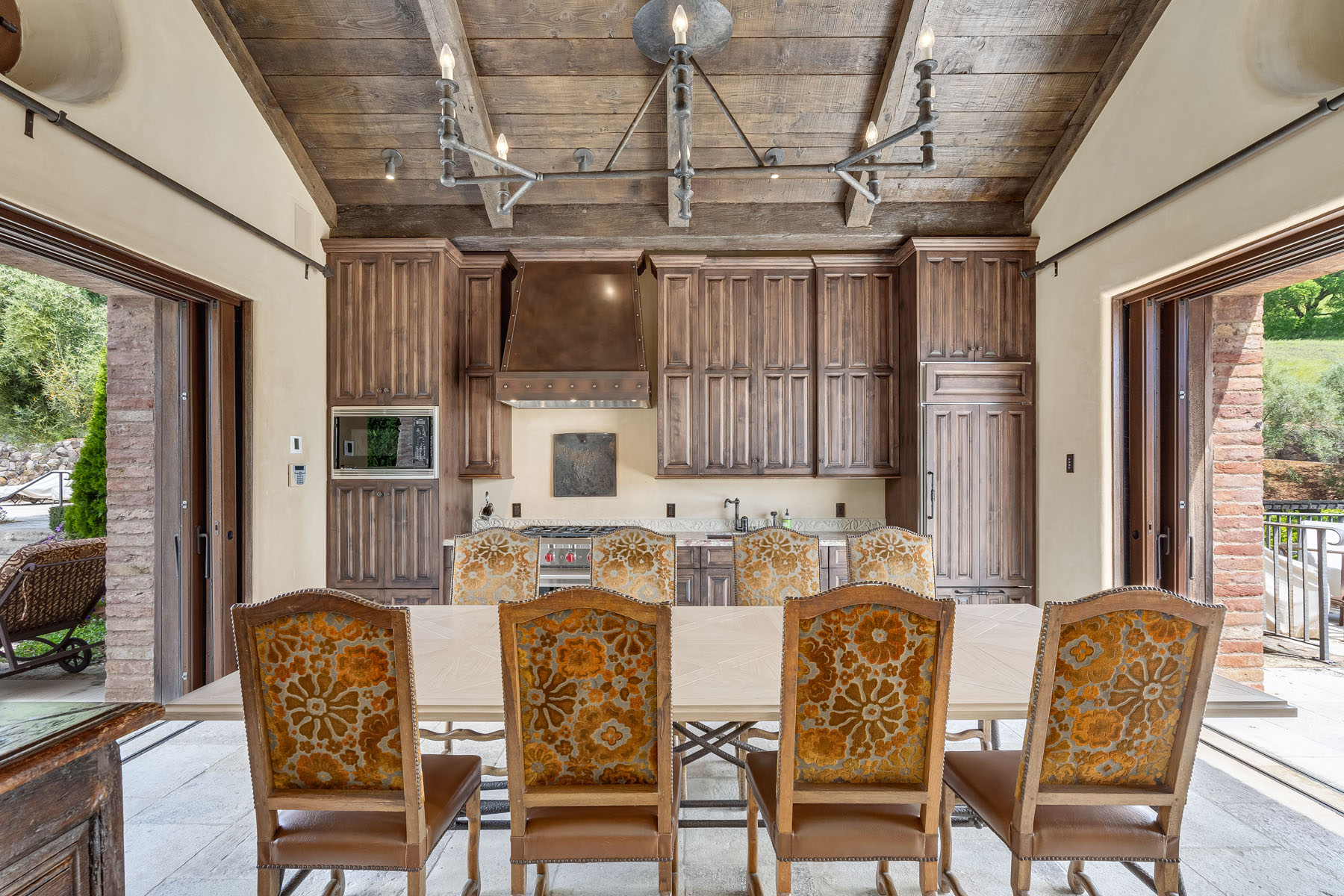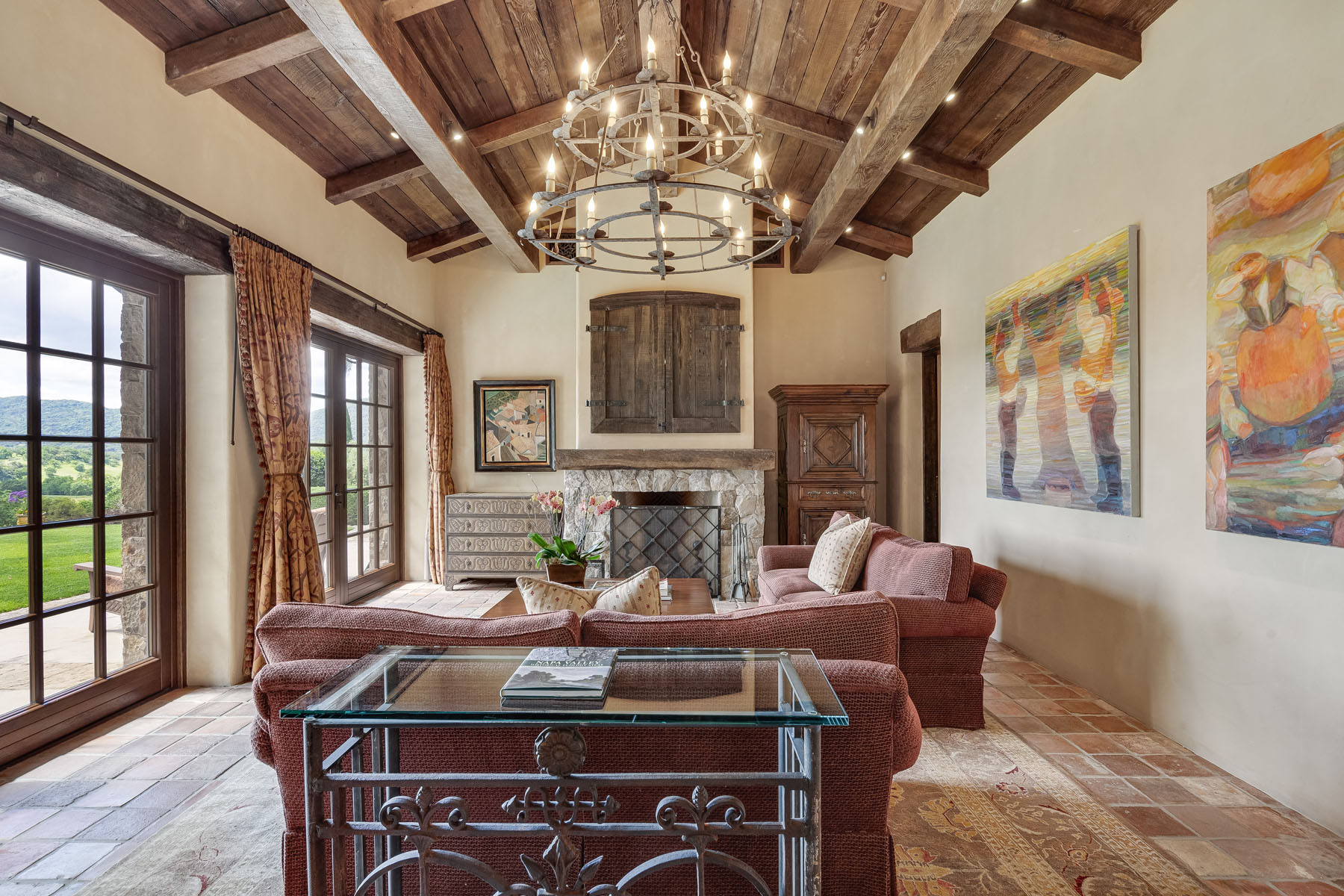 Family room, fully open to the kitchen and sharing the beamed and paneled cathedral ceiling, has a tiered Paul Ferante iron chandelier, fireplace outlined in stone beneath concealed media, and multiple French doors to the loggia