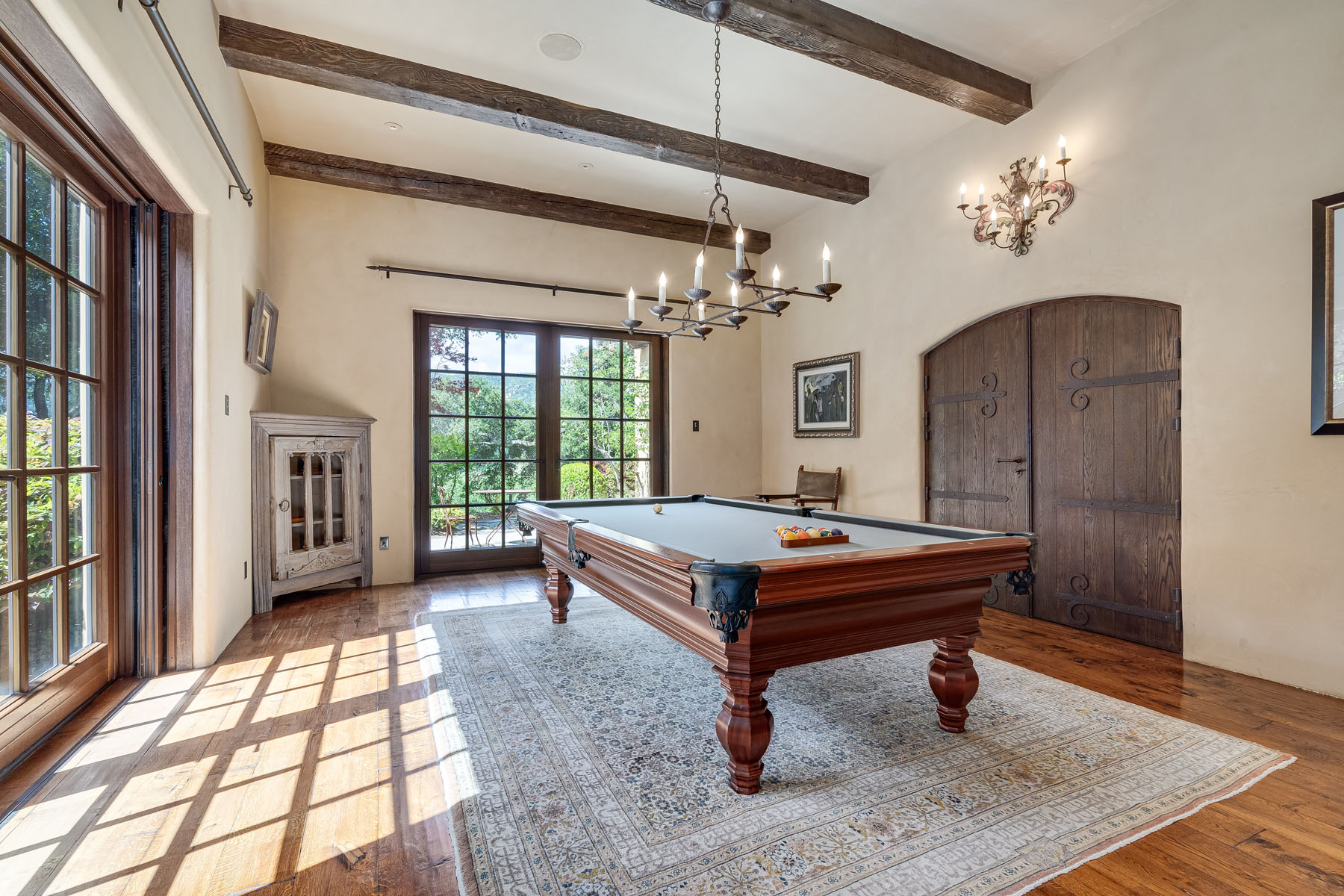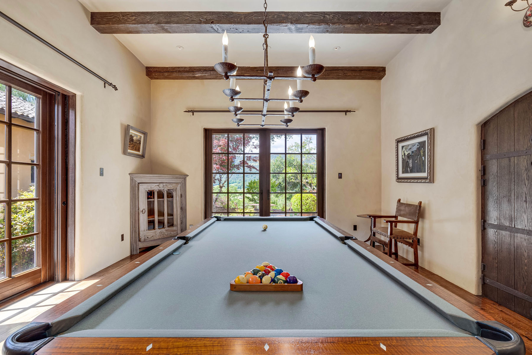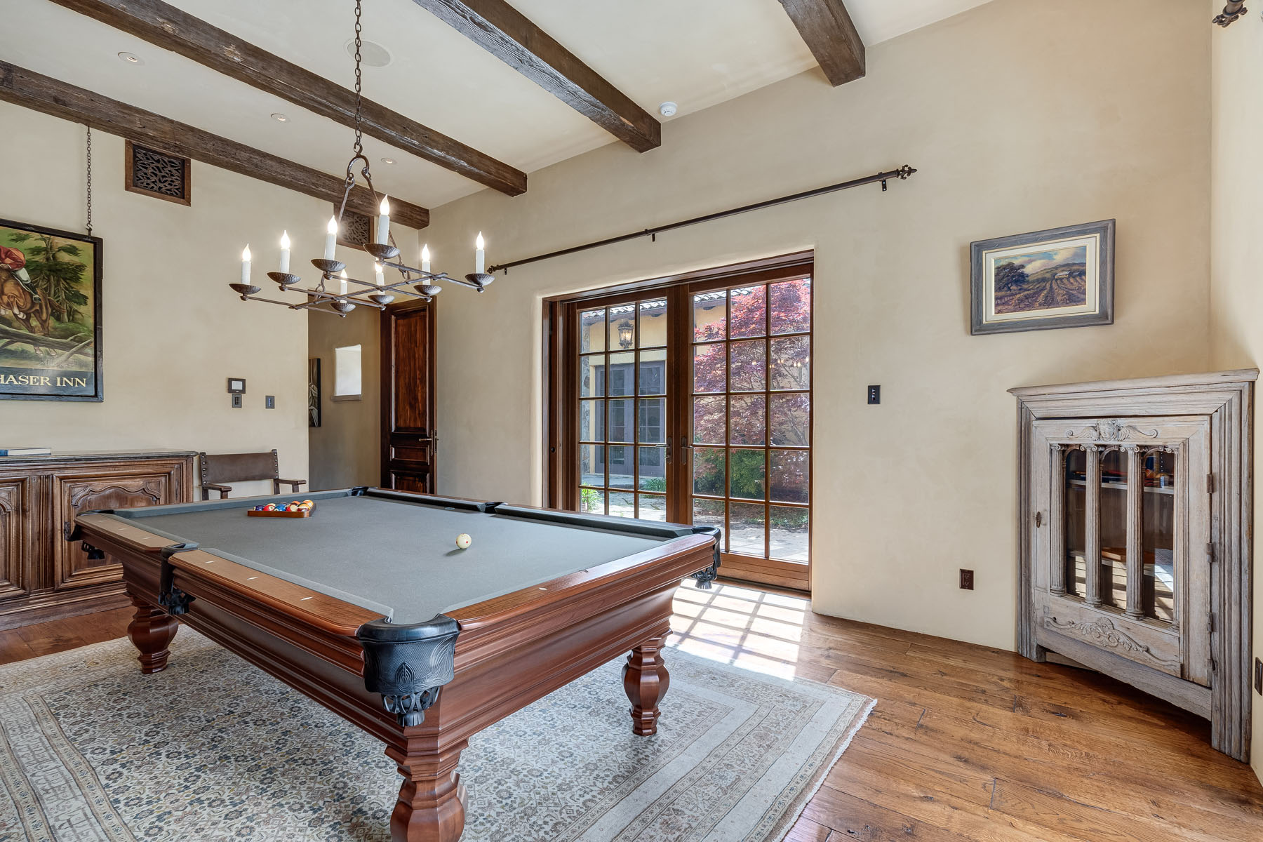Pool table room, off the recreation room and with access to the car museum, has a beamed ceiling with iron pool table chandelier plus French doors to the courtyard and to the grounds