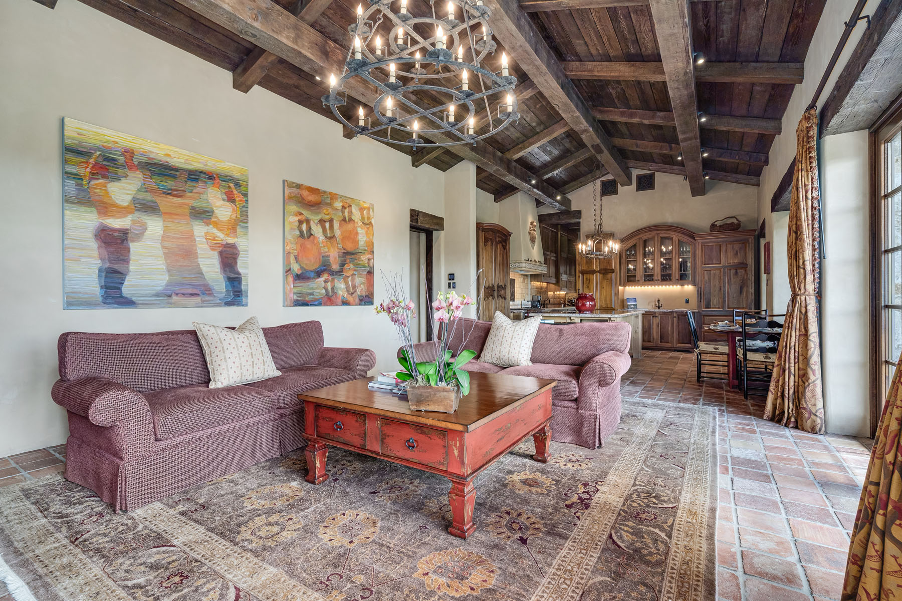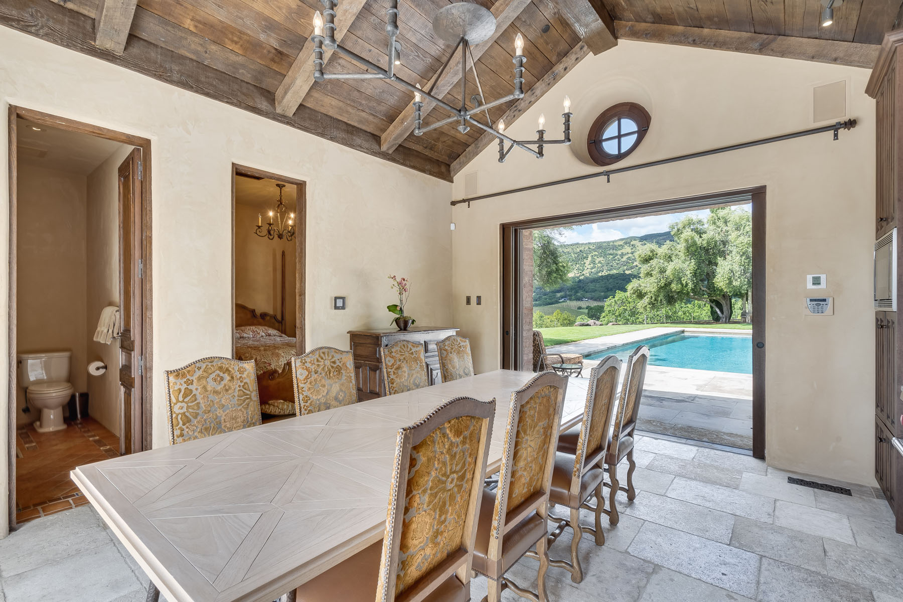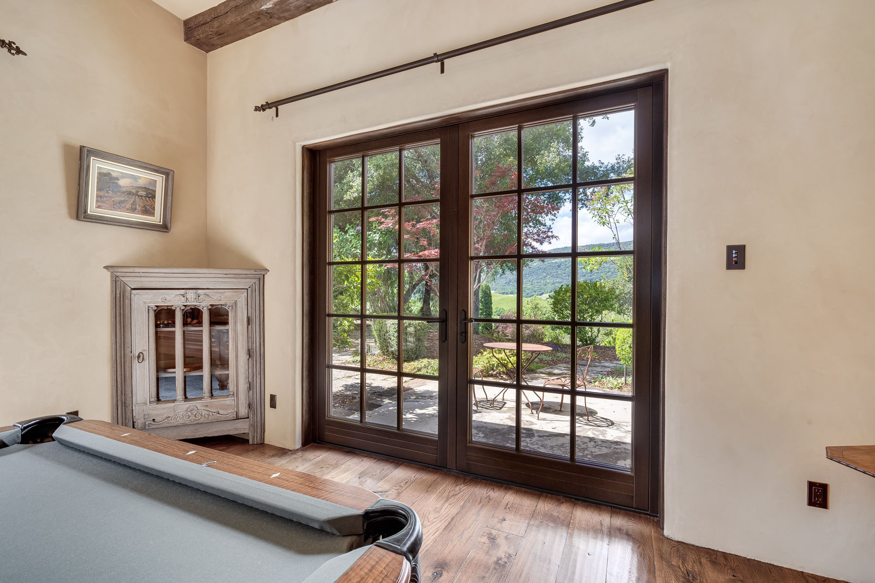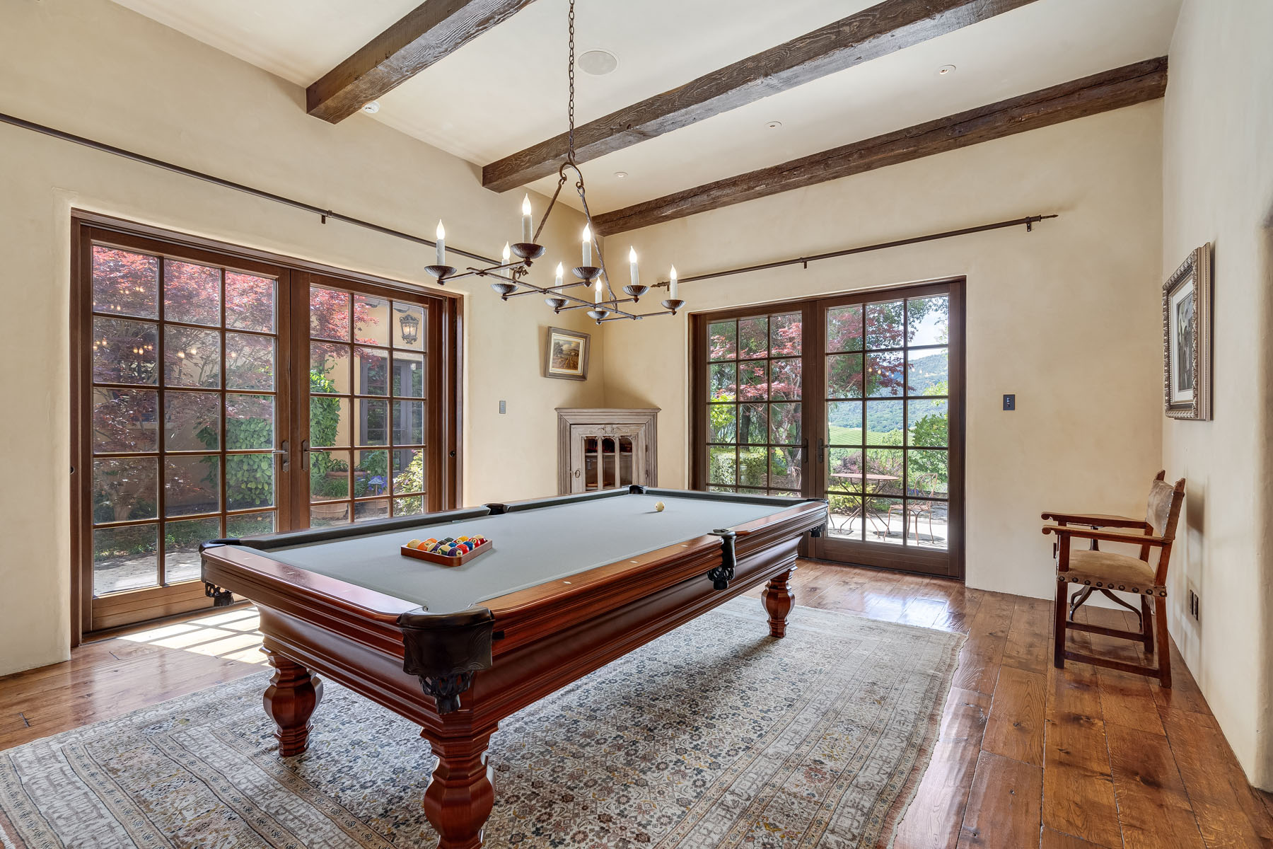 Pool table room, off the recreation room and with access to the car museum, has a beamed ceiling with iron pool table chandelier plus French doors to the courtyard and to the grounds