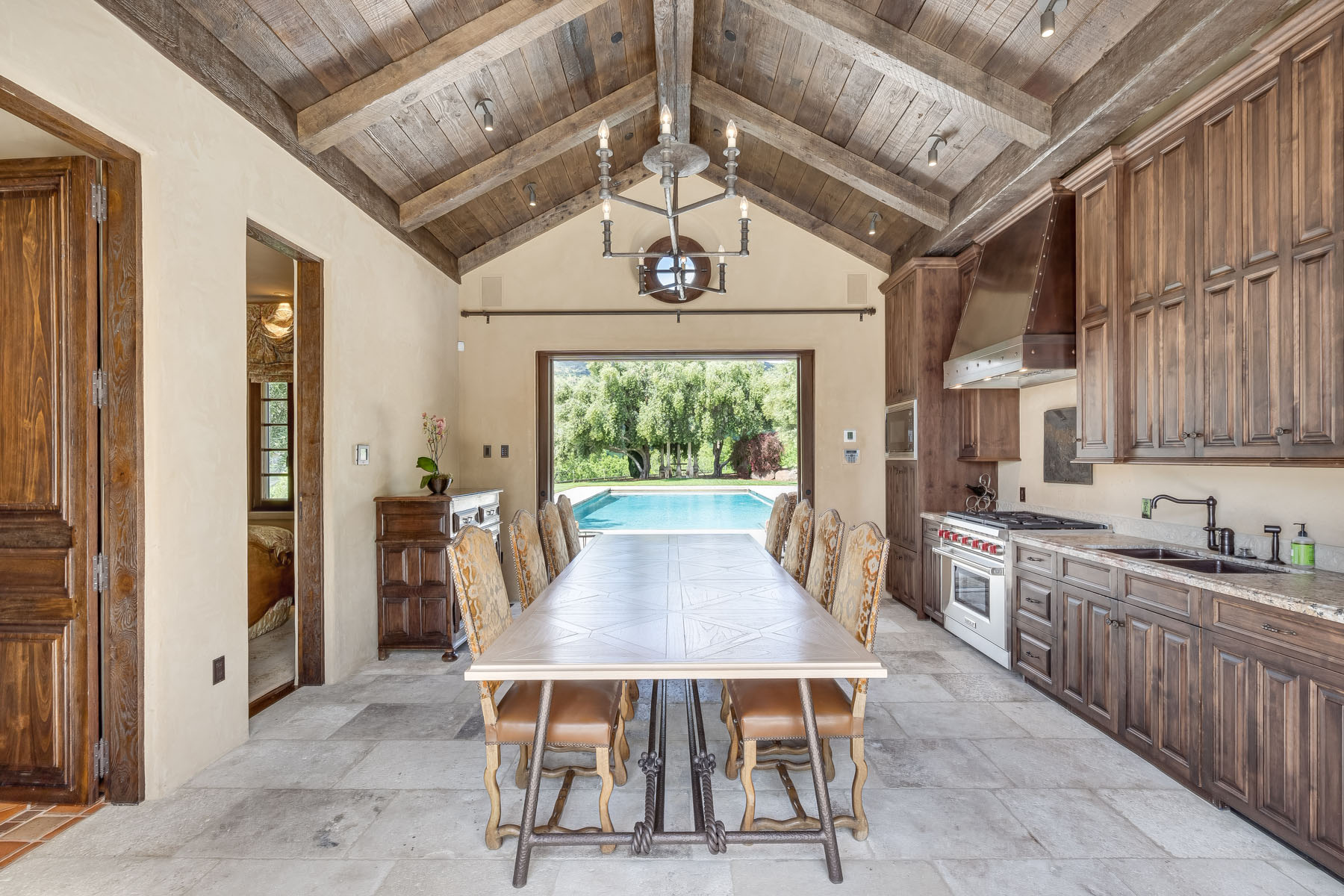 Guest house has: all-natural stone flooring; beamed and paneled cathedral ceiling; living/dining area with sliding glass doors overlooking the tennis court; full kitchen with Wolf gas range and microwave, Miele dishwasher, and Sub-Zero refrigerator; separate bedroom; dual-entry bath with frameless-glass shower