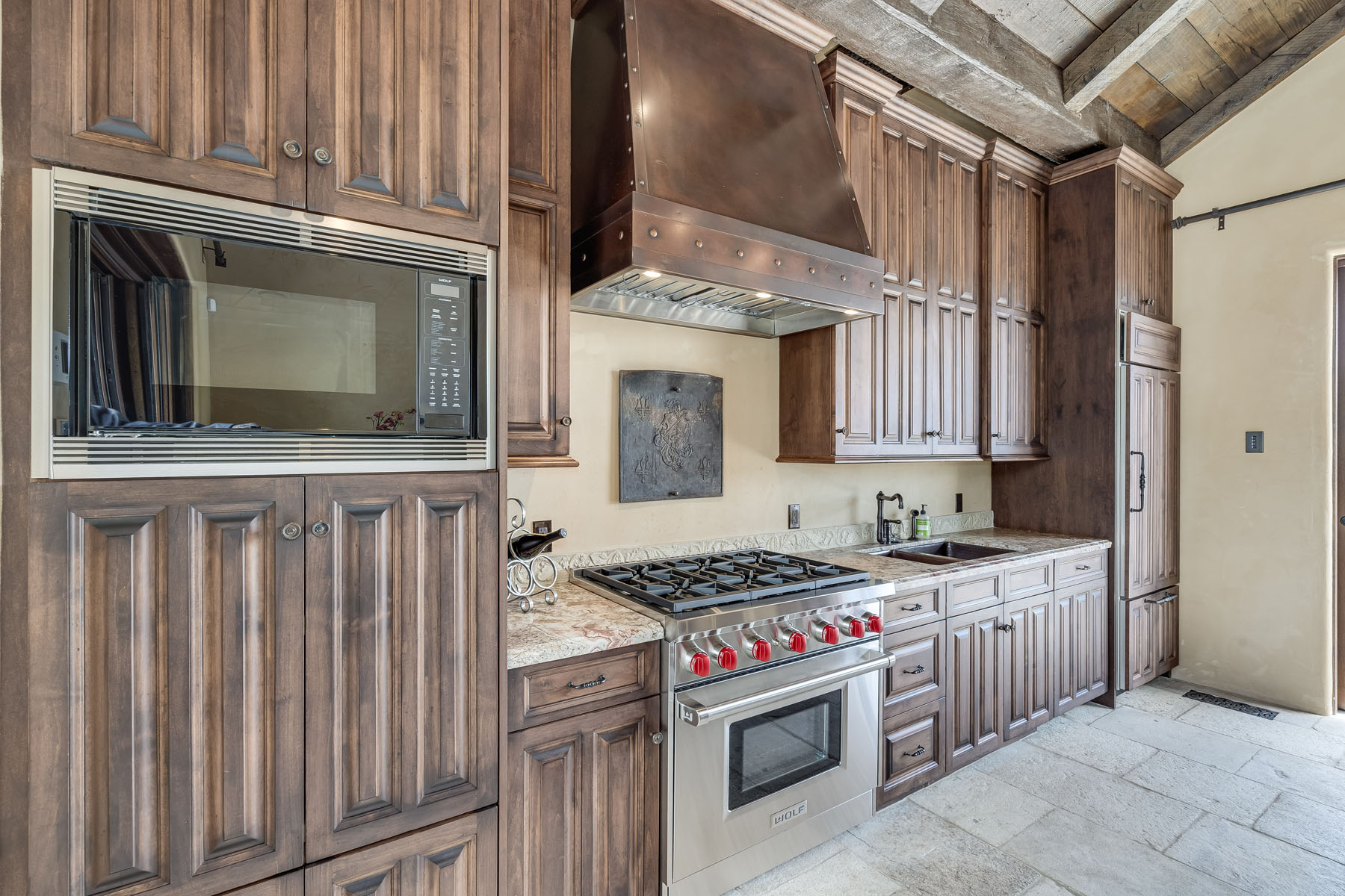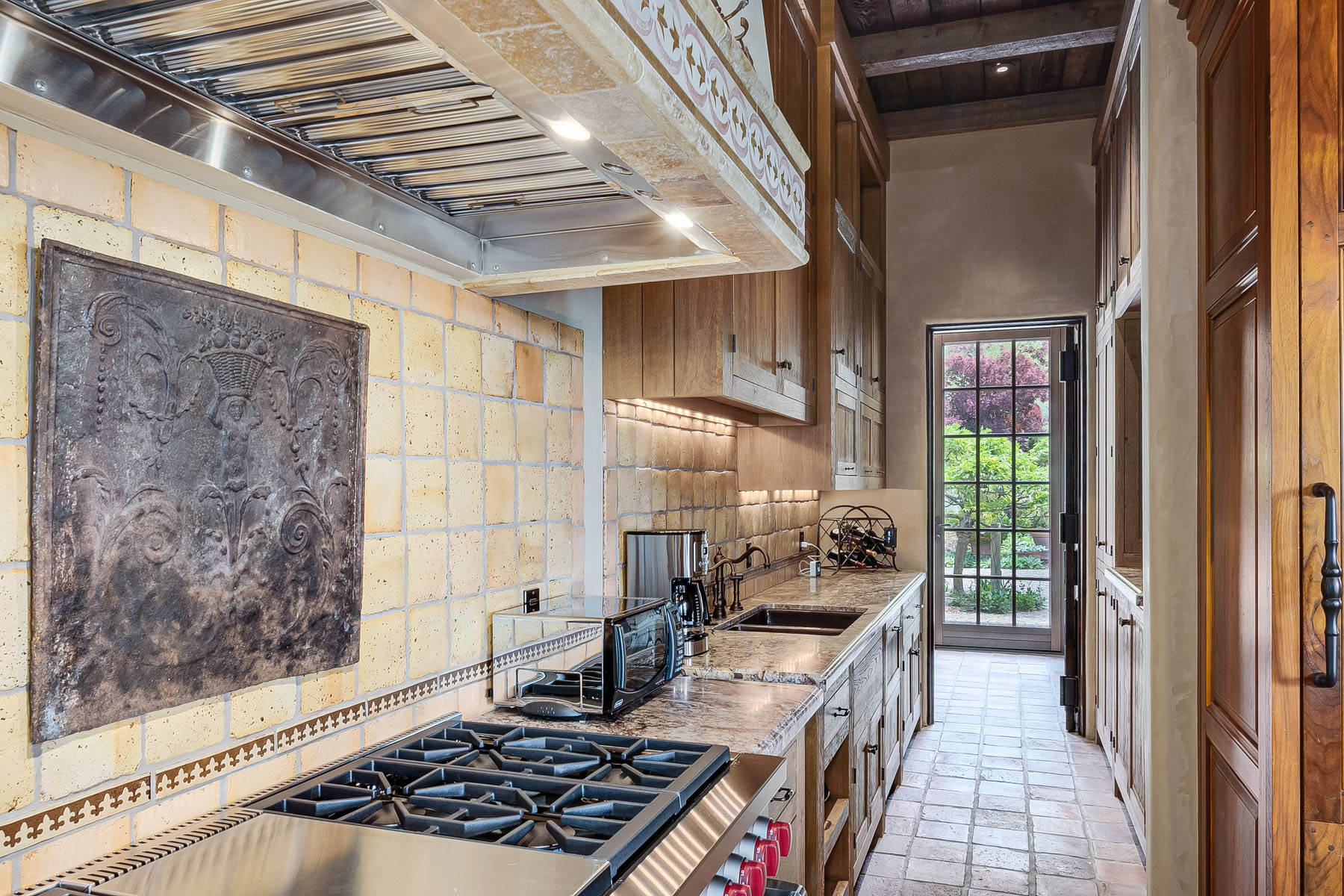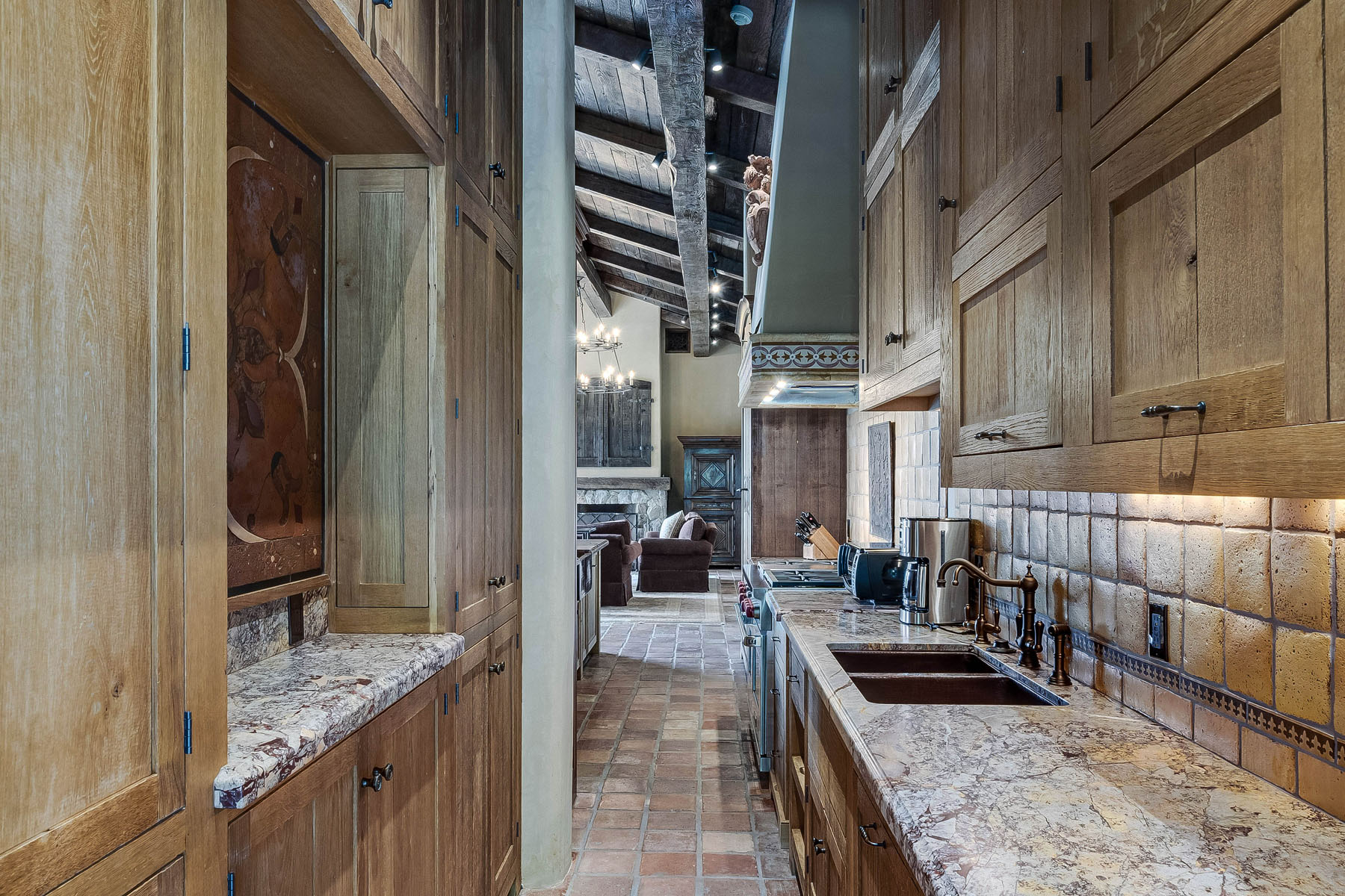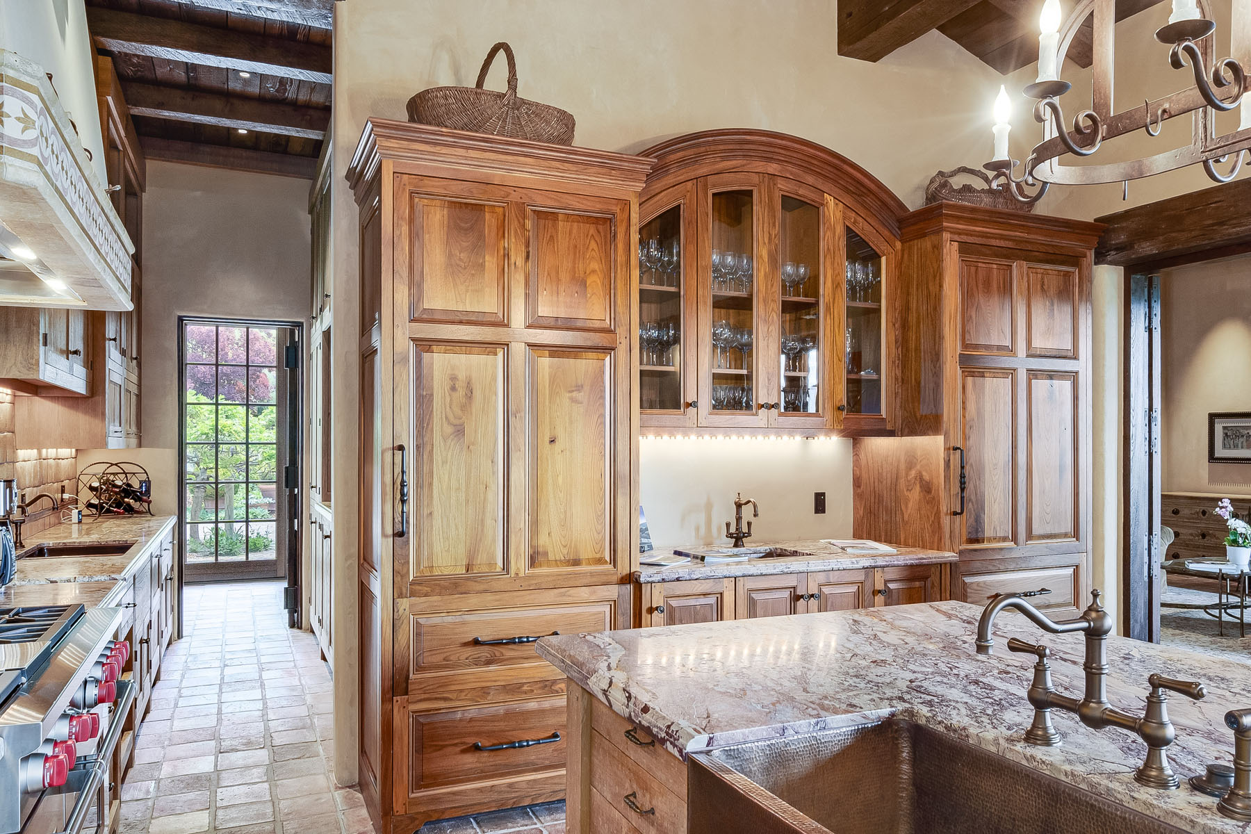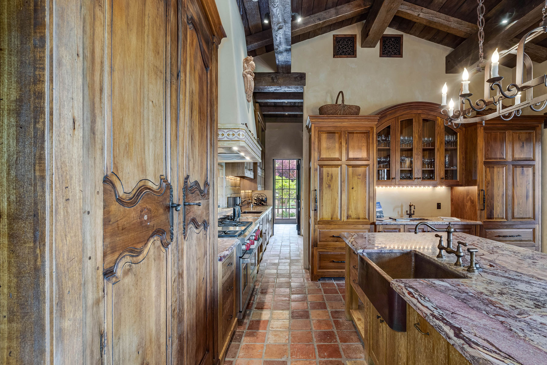 Country French kitchen has solid wood custom cabinetry, antique doors concealing dish storage, granite slab counters, ceramic tile backsplashes with inlaid marquetry, and a copper apron sink; island with counter seating plus separate breakfastalcove with built-in banquette; separate butler’s area with dual-compartment copper sink and significant cabinetry
