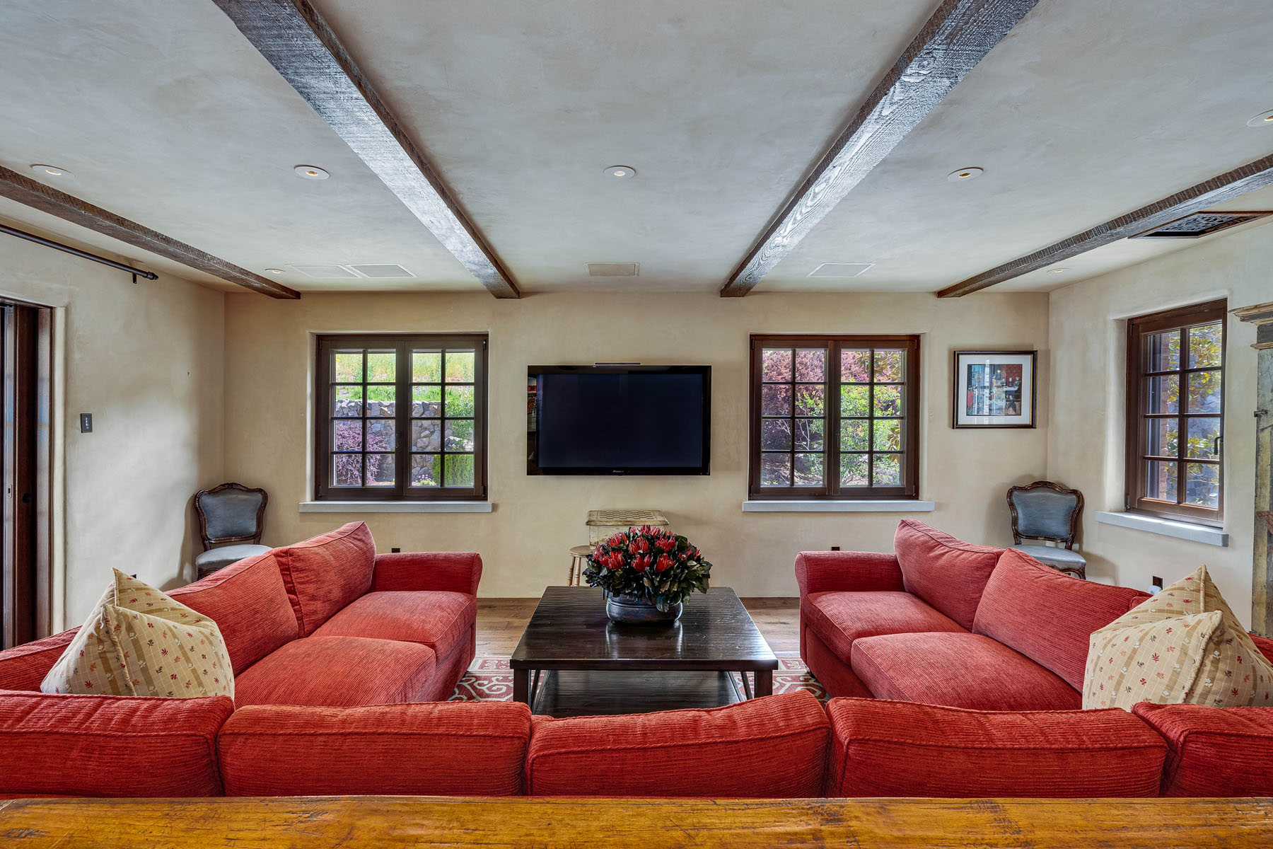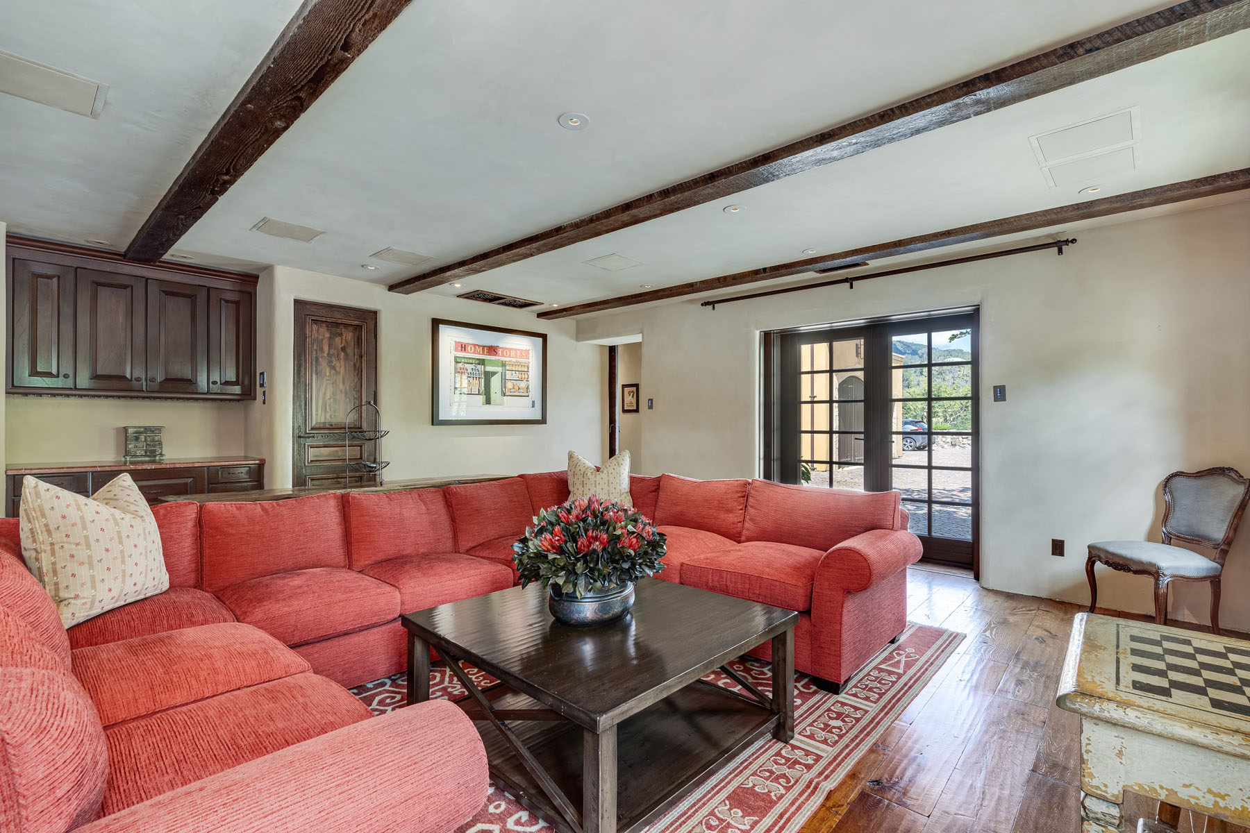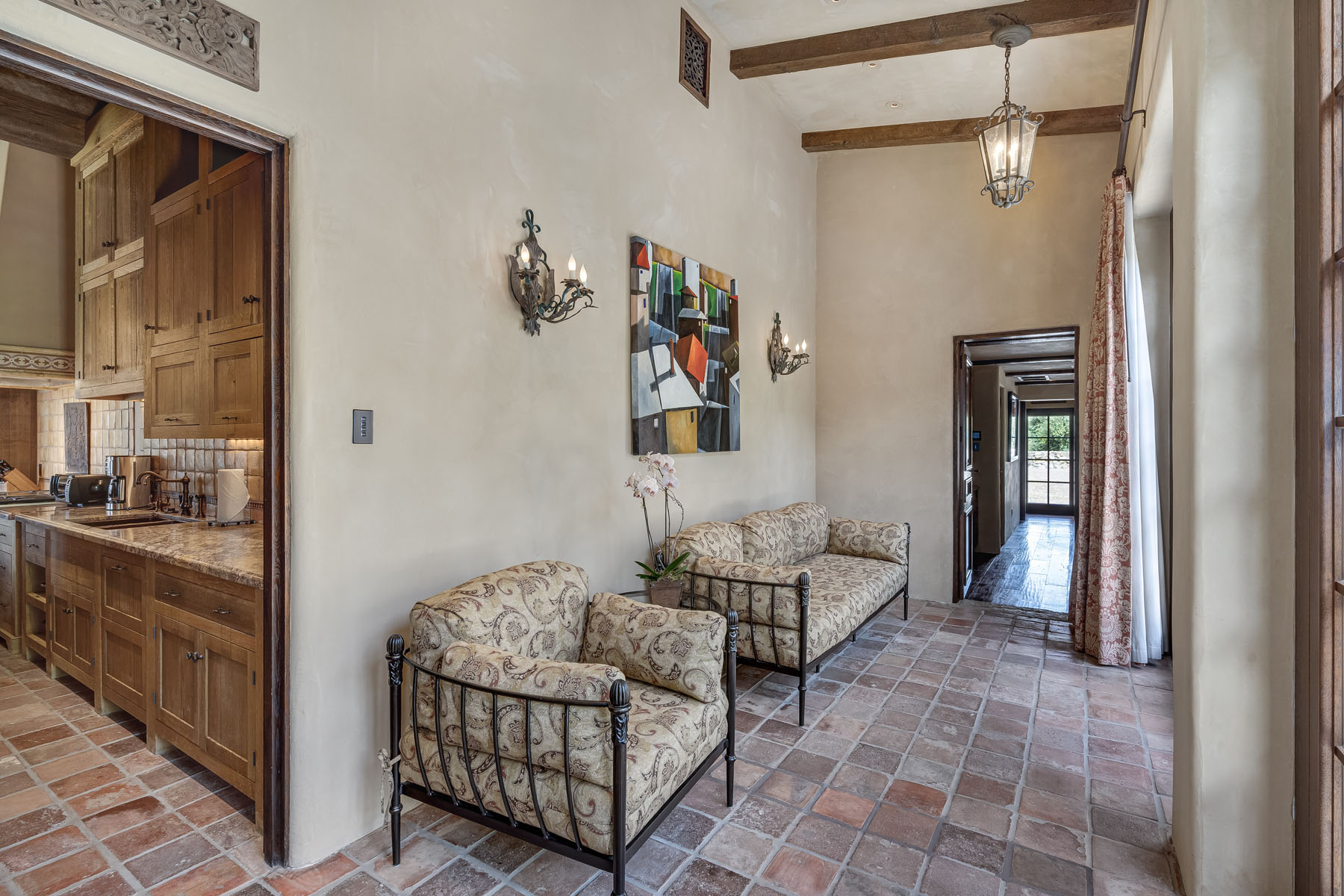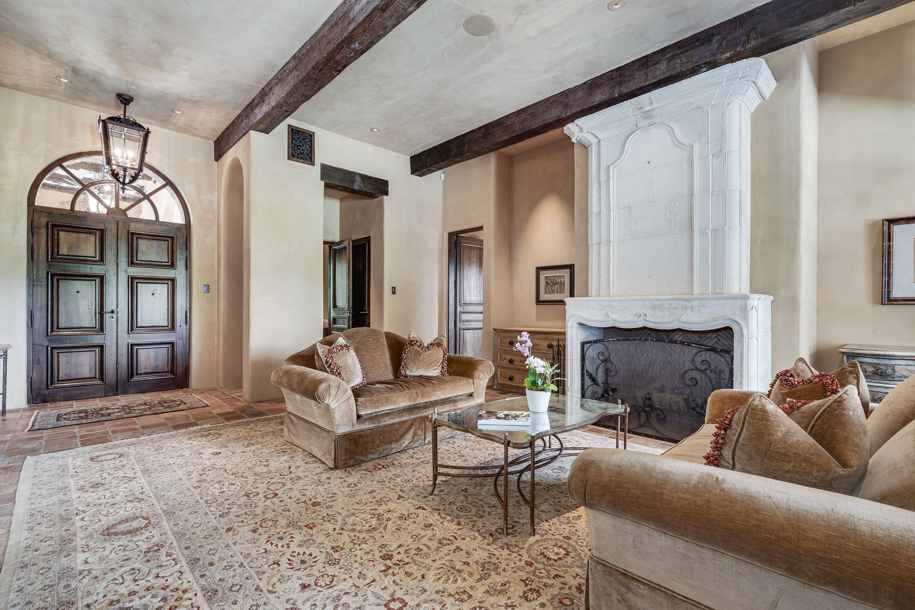 Double doors beneath a fan light open to the foyer; subtly hued plaster walls, hand-hewn ceiling beams, and stone paver or hardwood floors continue into most rooms
