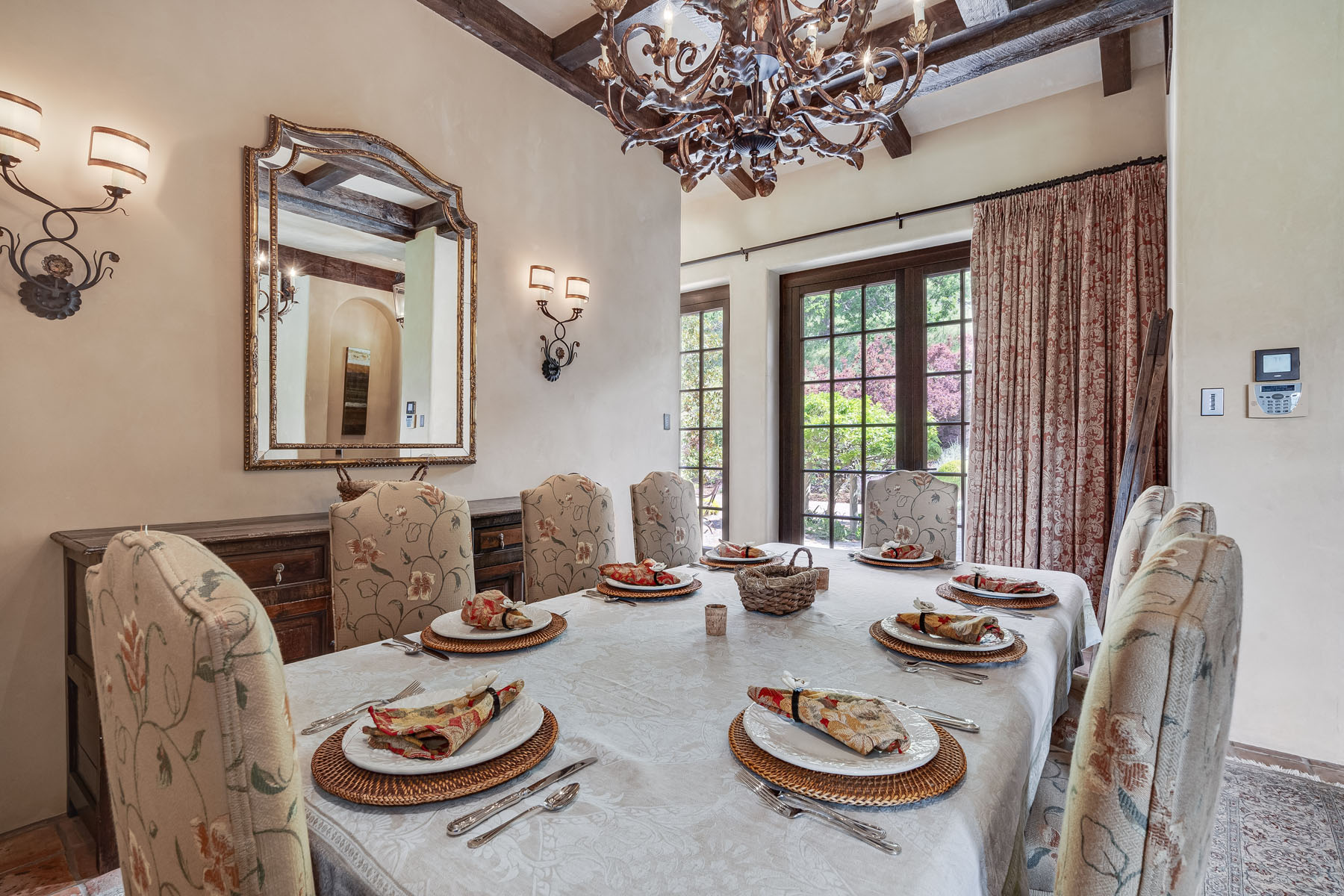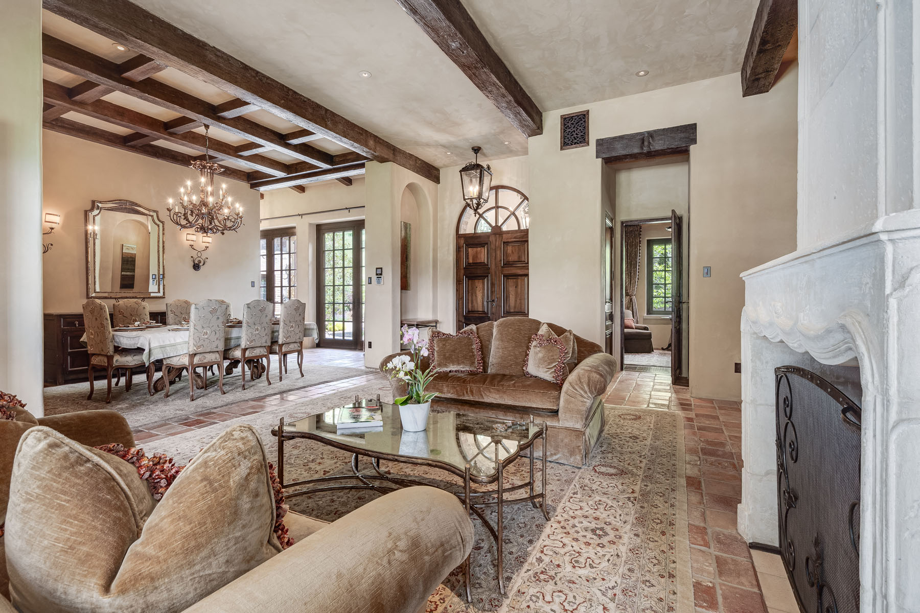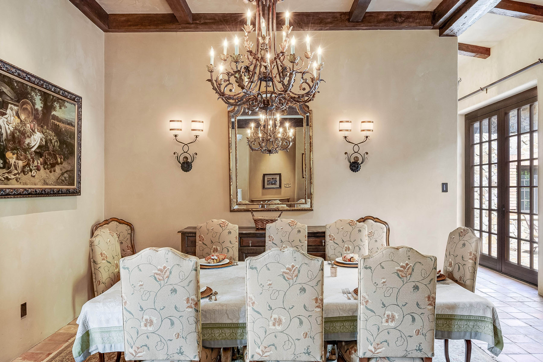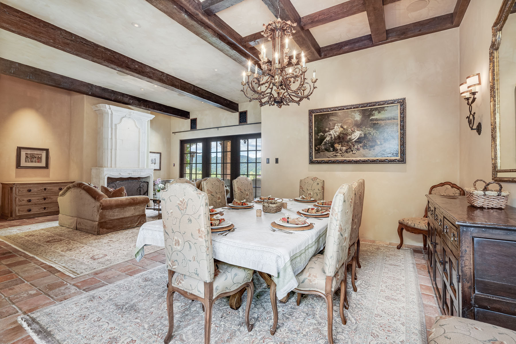 Formal dining room features a beamed and coffered ceiling with tiered chandelier plus French doors to the front terrace and extending to the motor court