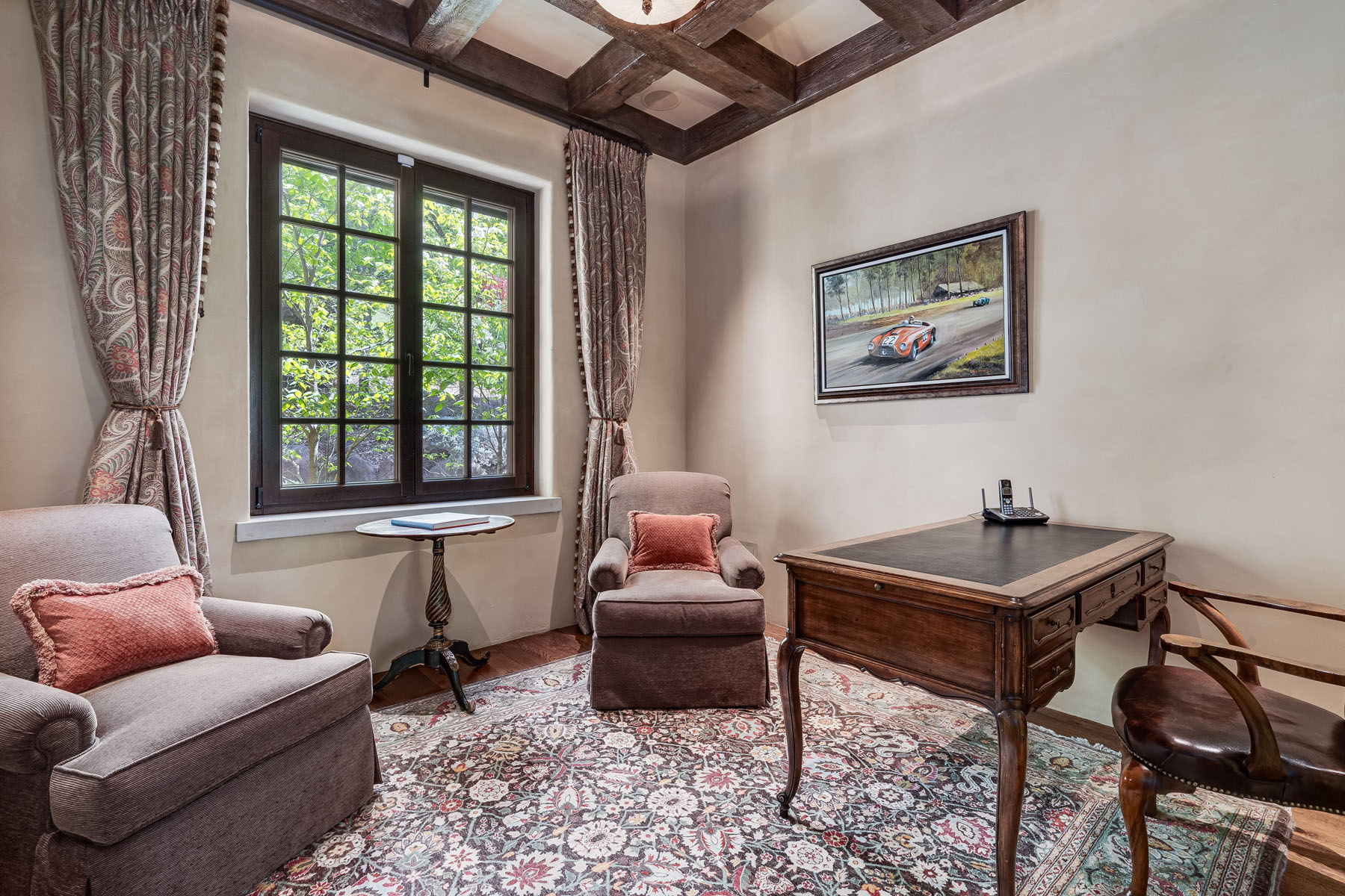 Office with beamed and coffered ceiling and alabaster pendant light adjacent to the primary suite