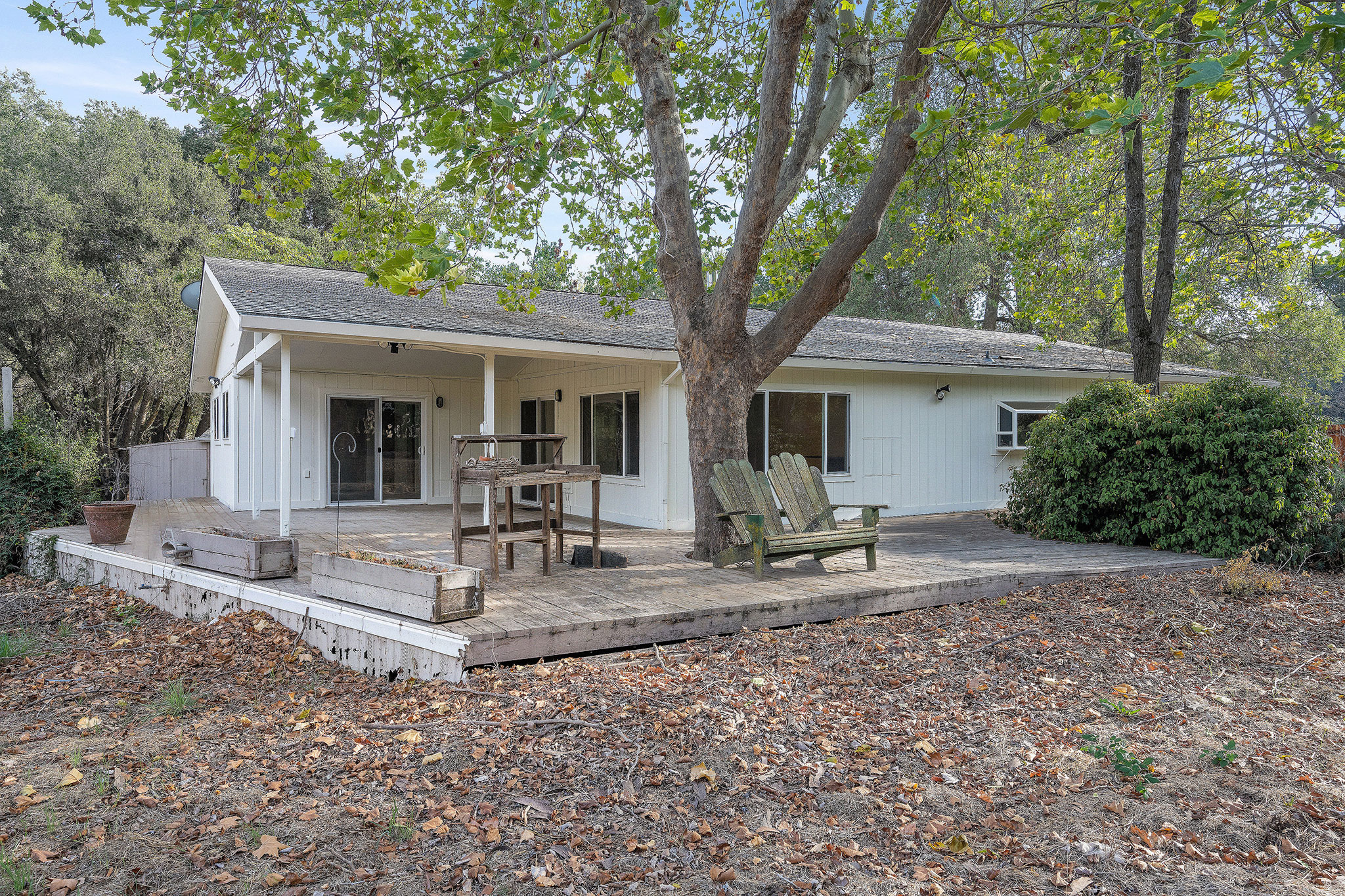 - Living/dining room with wood stove and sliding glass door to the deck